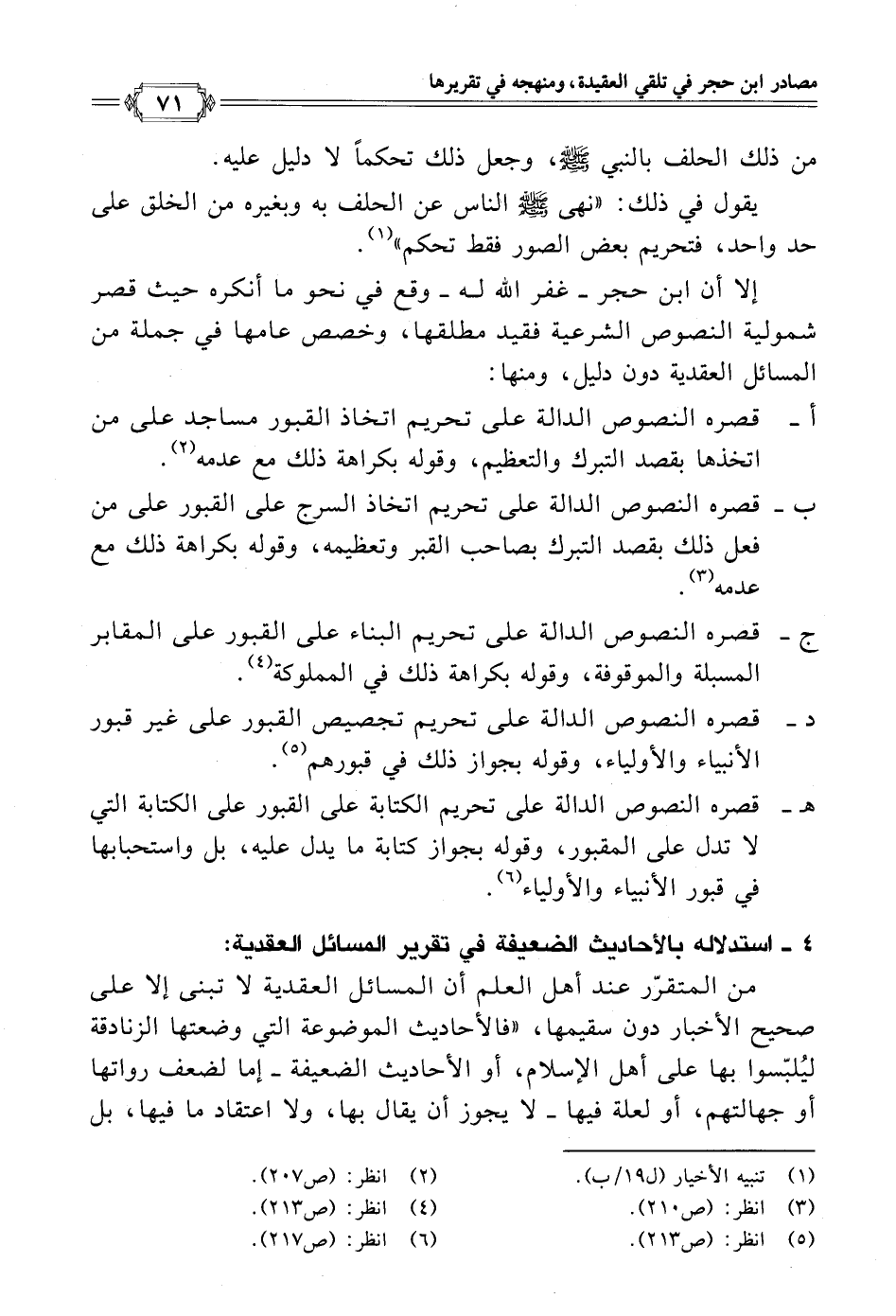 إلا أن - ابن حجر - غفر الله له - وقع في نحو ما أنكره حيث قصر شمولية النصوص الشرعية فقيد مطلقها، وخصص عامها في جملة من المسائل العقدية دون دليل، ومنها: