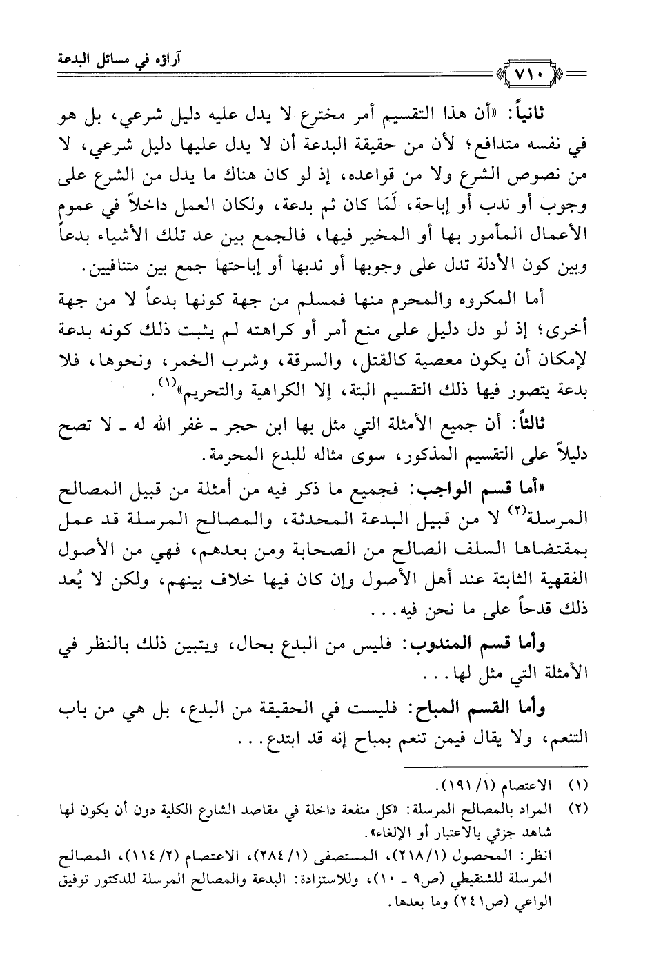 ثانيًا: "أن هذا التقسيم أمر مخترع لا يدل عليه دليل شرعي، بل هو في نفسه متدافع؛ لأن من حقيقة البدعة أن لا يدل عليها دليل شرعي، لا من نصوص الشرع ولا من قواعده، إذ لو كان هناك ما يدل من الشرع على وجوب أو ندب أو إباحة، لَمَا كان ثم بدعة، ولكان العمل داخلًا في عمومٍ الأعمال المأمور بها أو المخير فيها، فالجمع بين عد تلك الأشياء بدعًا وبين كون الأدلة تدل على وجوبها أو ندبها أو إباحتها جمع بين متنافيين.