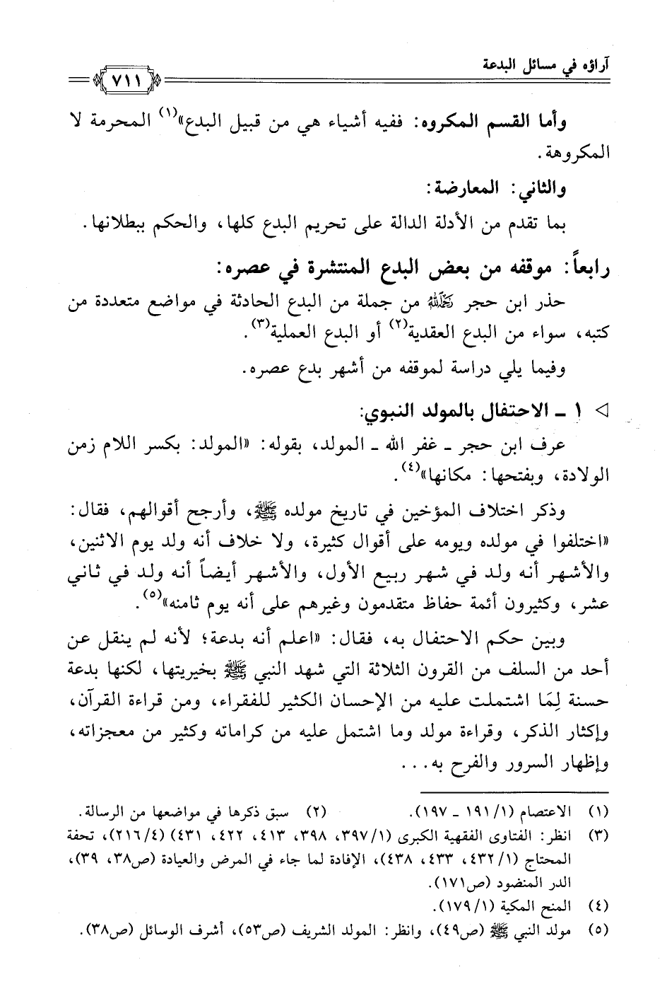 وبين حكم الاحتفال به، فقال: "اعلم أنه بدعة؛ لأنه لم ينقل عن أحد من السلف من القرون الثلاثة التي شهد النبي - صلى الله عليه وسلم - بخيريتها، لكنها بدعة حسنة لِمَا اشتملت عليه من الإحسان الكثير للفقراء، ومن قراءة القرآن، وإكثار الذكر، وقراءة مولد وما اشتمل عليه من كراماته وكثير من معجزاته، وإظهار السرور والفرح به ...