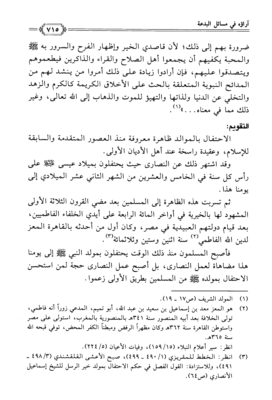 (¬٣) انظر: الخطط للمقريزي (١/ ٤٩٠ - ٤٩٩)، صبح الأعشى القلقشندي (٣/ ٤٩٨ - ٤٩١)، وللاستزادة: القول الفصل في حكم الاحتفال بمولد خير الرسل للشيخ إسماعيل الأنصاري (ص ٦٤).