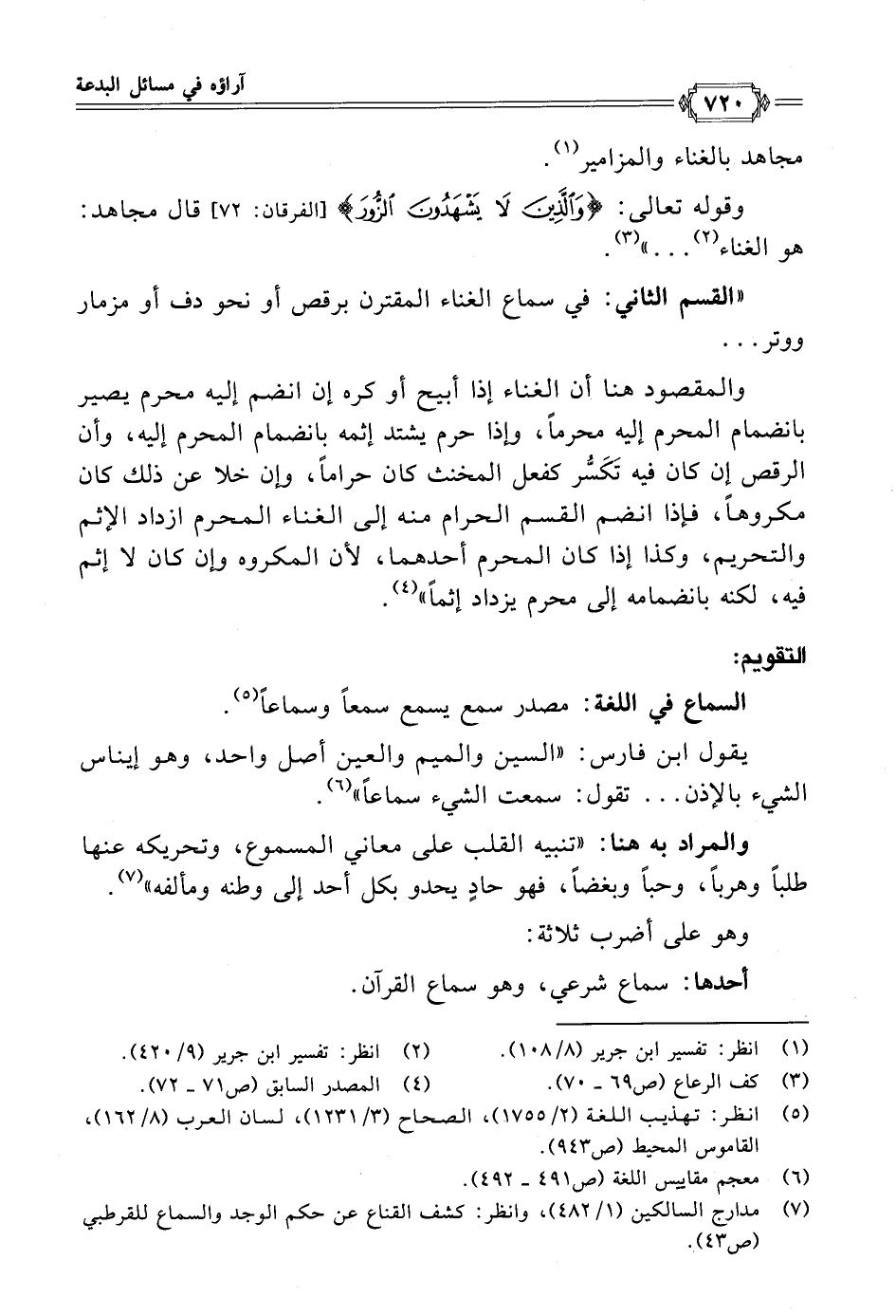 "القسم الثاني: في سماع الغناء المقترن برقص أو نحو دف أو مزمار ووتر ...