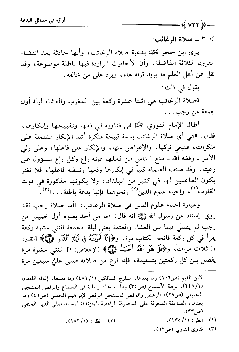 وعبارة إحياء علوم الدين في صلاة الرغائب: "أما صلاة رجب فقد روي بإسناد عن رسول الله - صلى الله عليه وسلم - أنه قال: "ما من أحد يصوم أول خميس من رجب ثم يصلي فيما بين العشاء والعتمة يعني ليلة الجمعة اثنتي عشرة ركعة يقرأ في كل ركعة فاتحة الكتاب مرة، و {إِنَّا أَنْزَلْنَاهُ فِي لَيْلَةِ الْقَدْرِ (١)} [القدر: ١] ثلاث مرات، و {قُلْ هُوَ اللَّهُ أَحَدٌ (١)} [الإخلاص: ١]، اثنتي عشرة مرة يفصل بين كل ركعتين بتسليمة، فإذا فرغ من صلاته صلى عليَّ سبعين مرة