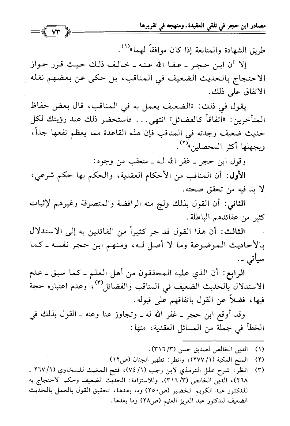 (¬٣) انظر: شرح علل الترمذي لابن رجب (١/ ٧٤)، فتح المغيث للسخاوي (١/ ٢٦٧ - ٢٦٨)، الدين الخالص (٣/ ٣١٦)، وللاستزادة: الحديث الضعيف وحكم الاحتجاج به للدكتور عبد الكريم الخضير (ص ٢٥٠) وما بعدها، تحقيق القول بالعمل بالحديث الضعيف للدكتور عبد العزيز العثيم (ص ٢٨) وما بعدها.