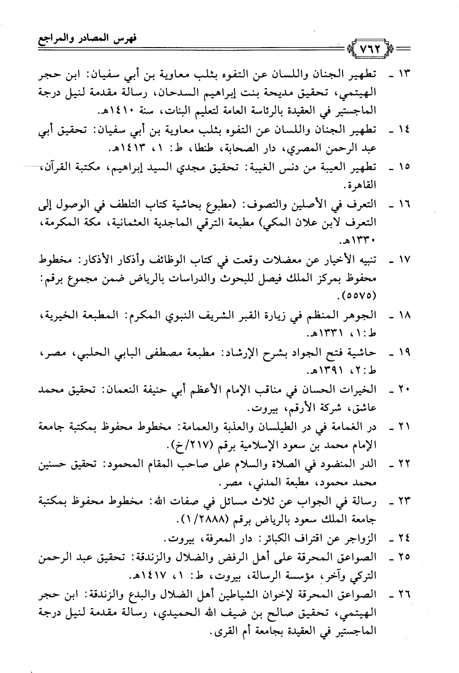 ٢٦ - الصواعق المحرقة لإخوان الشياطين أهل الضلال والبدع والزندقة: ابن حجر الهيتمي، تحقيق صالح بن ضيف الله الحميدي، رسالة مقدمة لنيل درجة الماجستير في العقيدة بجامعة أم القرى.