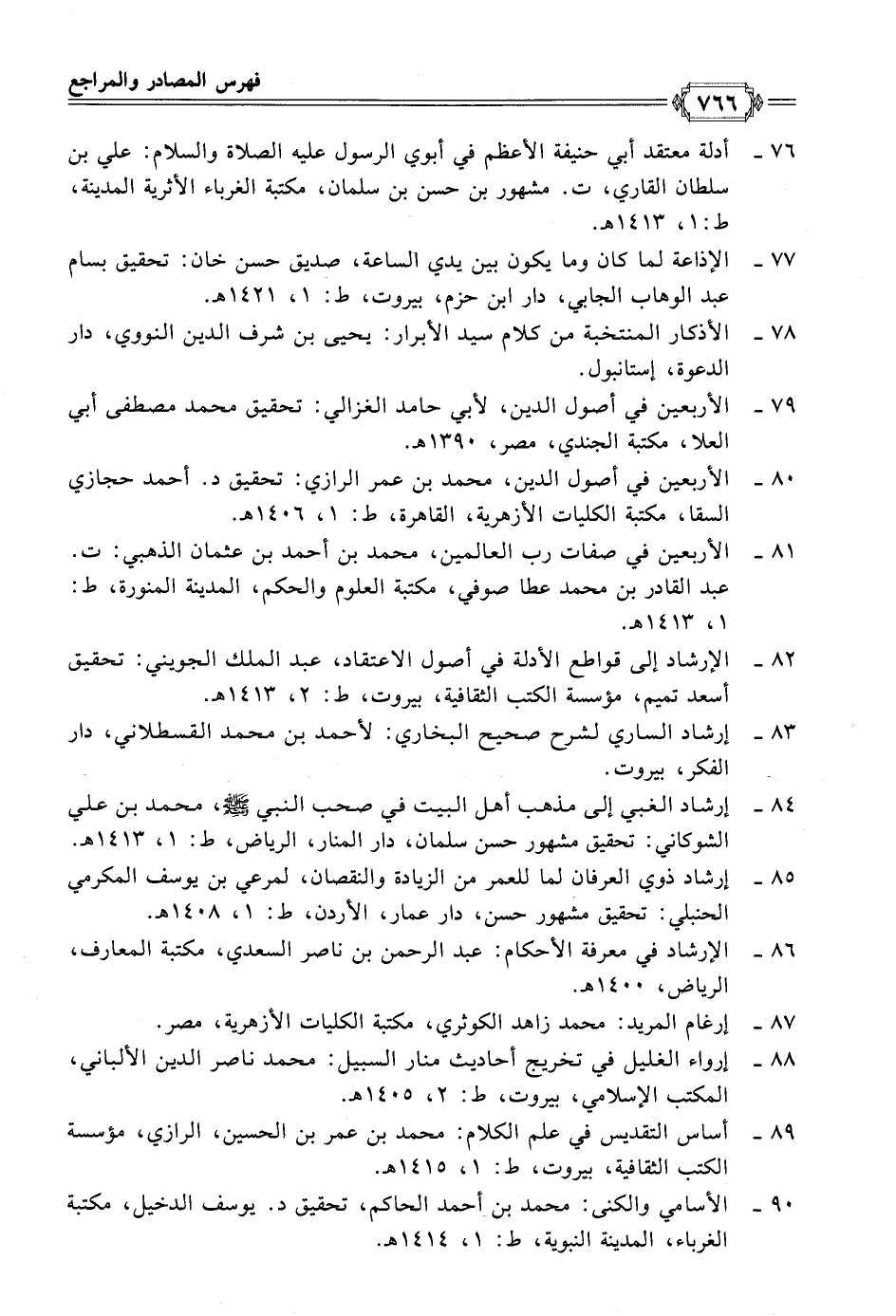 ٧٦ - أدلة معتقد أبي حنيفة الأعظم في أبوي الرسول عليه الصلاة والسلام: علي بن سلطان القاري، ت. مشهور بن حسن بن سلمان، مكتبة الغرباء الأثرية المدينة، ط: ١، ١٤١٣ هـ.