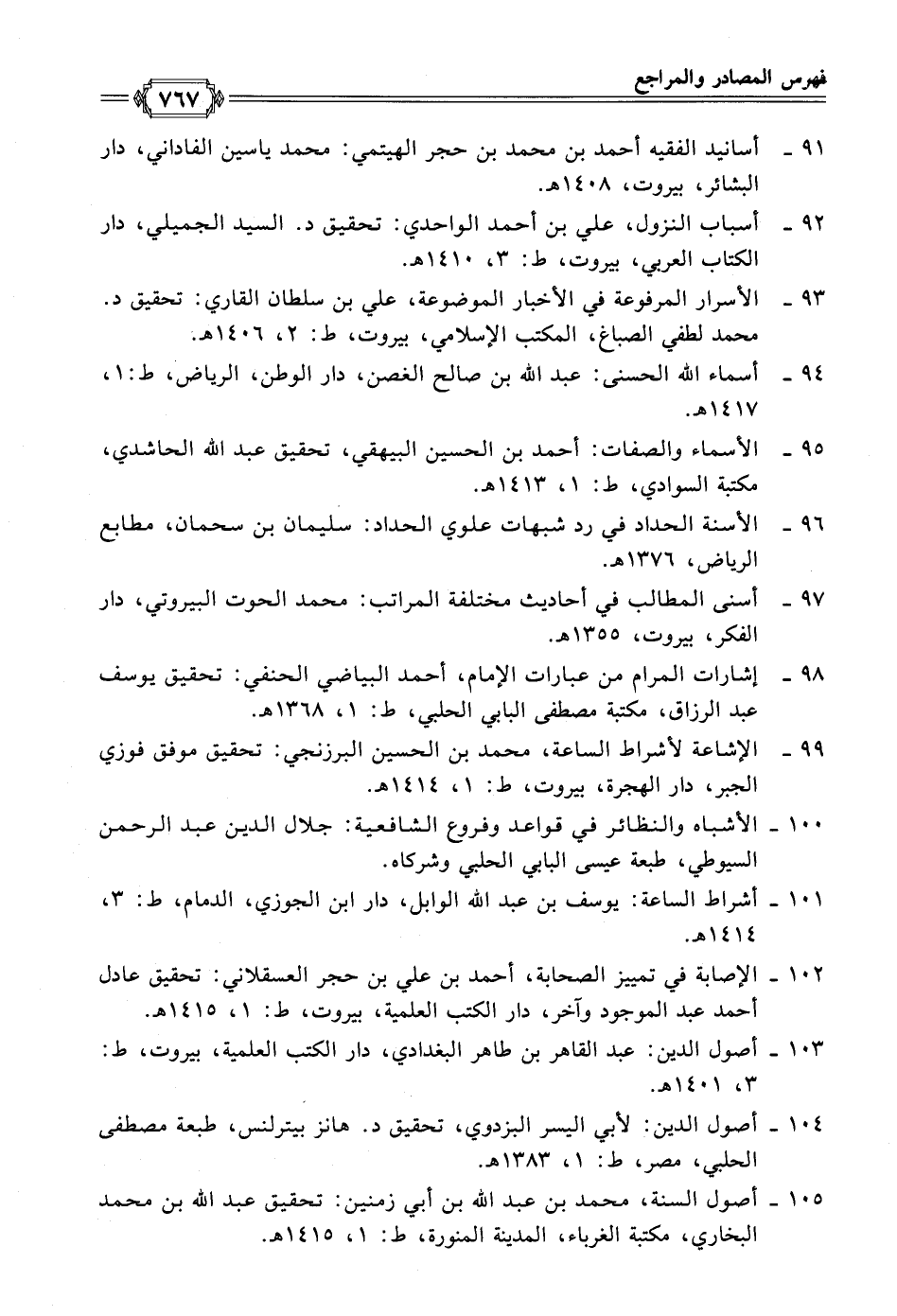 ٩٣ - الأسرار المرفوعة في الأخبار الموضوعة، علي بن سلطان القاري: تحقيق د. محمد لطفي الصباغ، المكتب الإسلامي، بيروت، ط: ٢، ١٤٠٦ هـ.