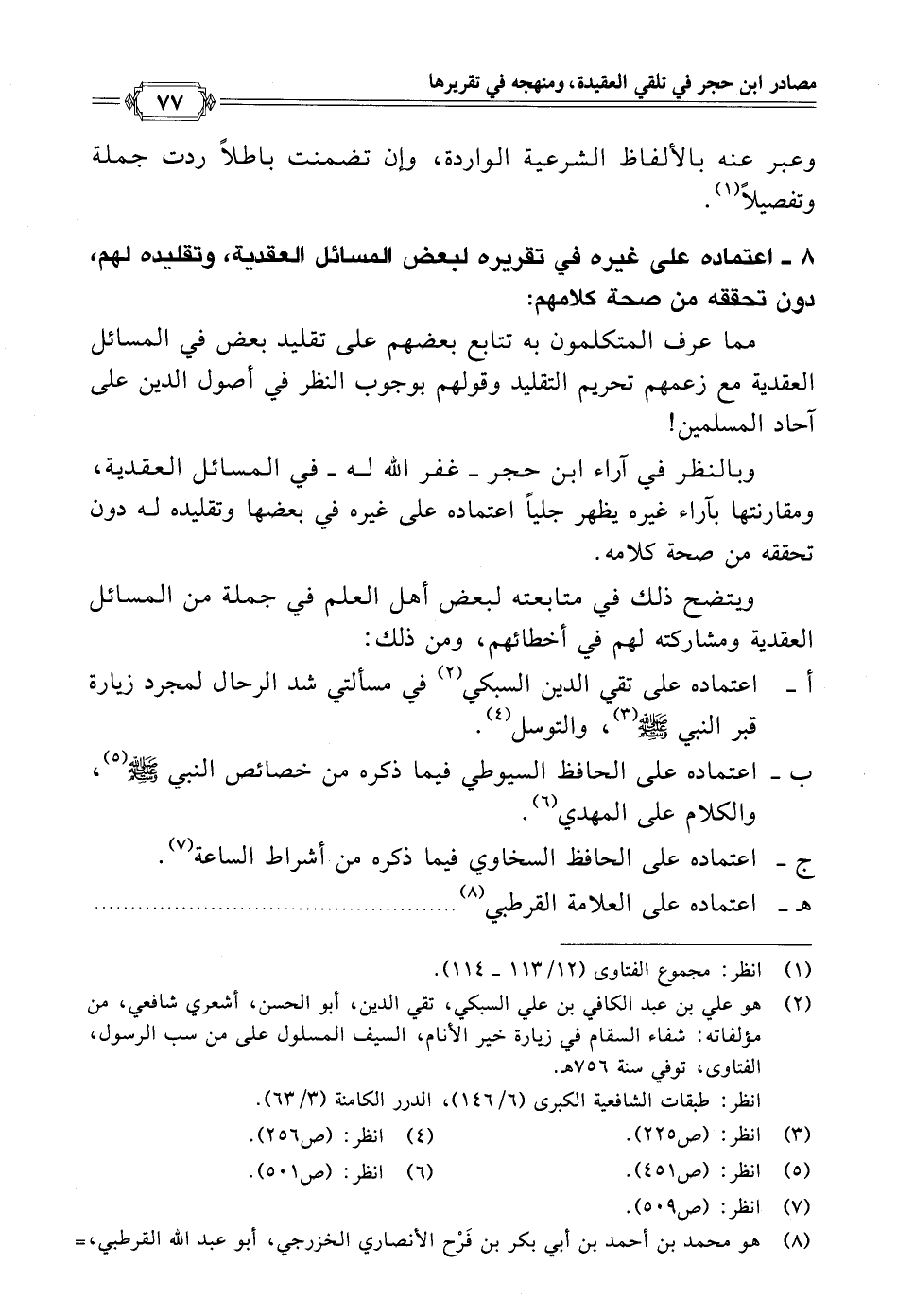أ - اعتماده على تقي الدين السبكي (¬٢) في مسألتي شد الرحال لمجرد زيارة قبر النبي - صلى الله عليه وسلم - (¬٣)، والتوسل (¬٤).