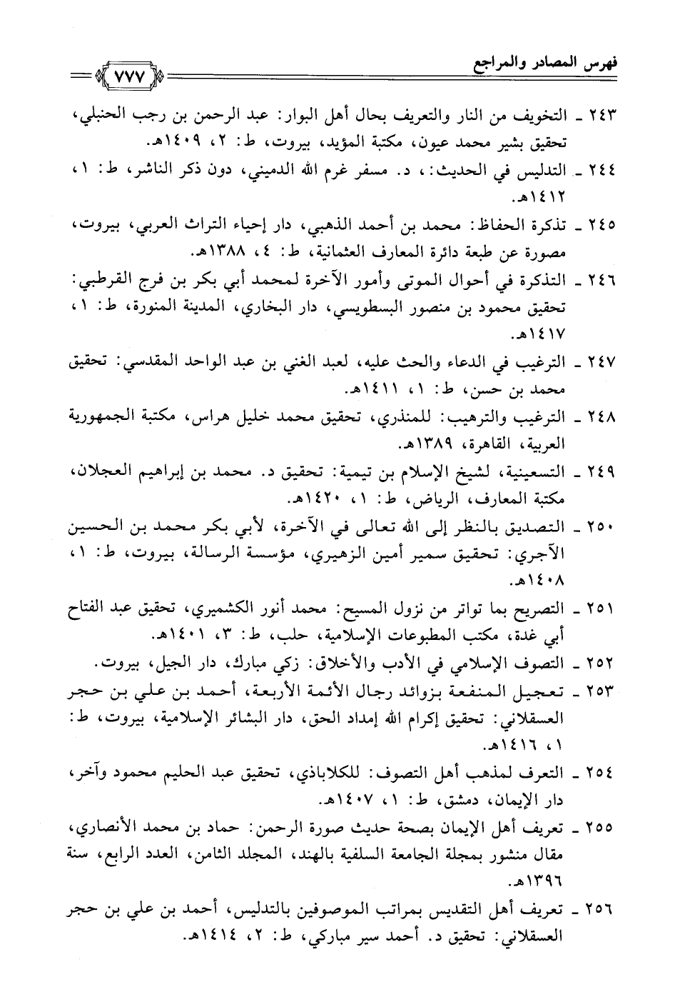 ٢٤٣ - التخويف من النار والتعريف بحال أهل البوار: عبد الرحمن بن رجب الحنبلي، تحقيق بشير محمد عيون، مكتبة المؤيد، بيروت، ط: ٢، ١٤٠٩ هـ.
