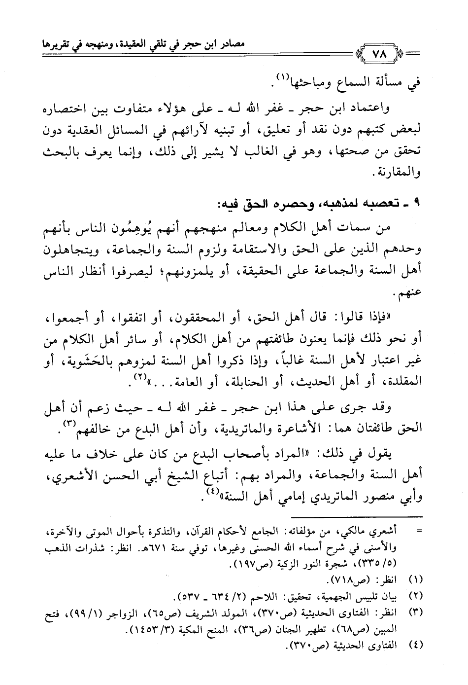 وقد جرى على هذا ابن حجر - غفر الله له - حيث زعم أن أهل الحق طائفتان هما: الأشاعرة والماتريدية، وأن أهل البدع من خالفهم (¬٣).