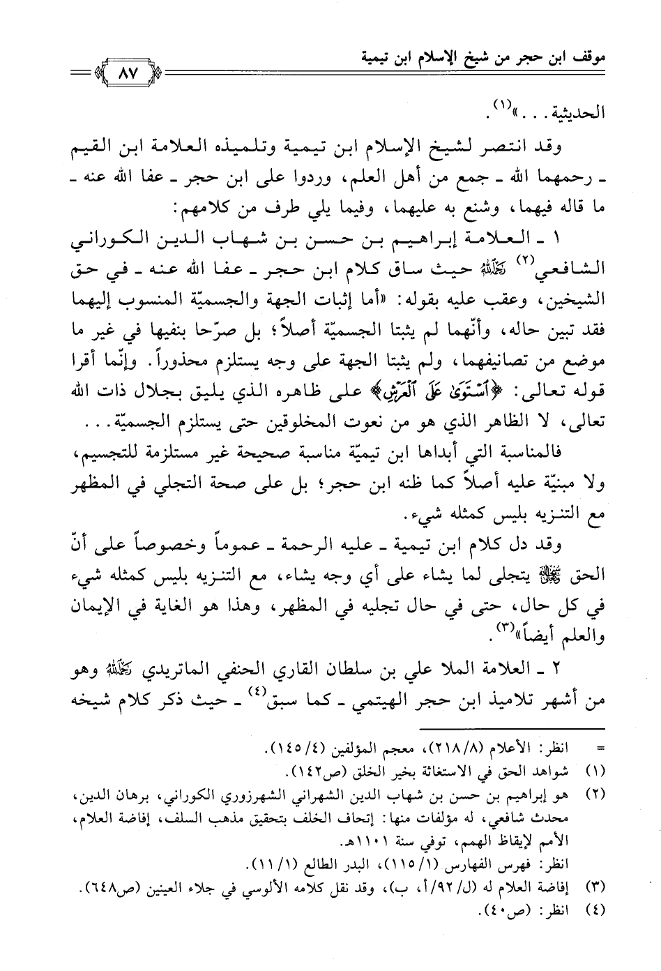 ١ - العلامة إبراهيم بن حسن بن شهاب الدين الكوراني الشافعي (¬٢) - رَحِمَهُ اللَّه - حيث ساق كلام ابن حجر - عفا الله عنه - في حق الشيخين، وعقب عليه بقوله: "أما إثبات الجهة والجسميّة المنسوب إليهما فقد تبين حاله، وأنّهما لم يثبتا الجسميّة أصلًا؛ بل صرّحا بنفيها في غير ما موضع من تصانيفهما، ولم يثبتا الجهة على وجه يستلزم محذورًا. وإنّما أقرا قوله تعالى: {اسْتَوَى عَلَى الْعَرْشِ} على ظاهره الذي يليق بجلال ذات الله تعالى، لا الظاهر الذي هو من نعوت المخلوقين حتى يستلزم الجسميّة ...