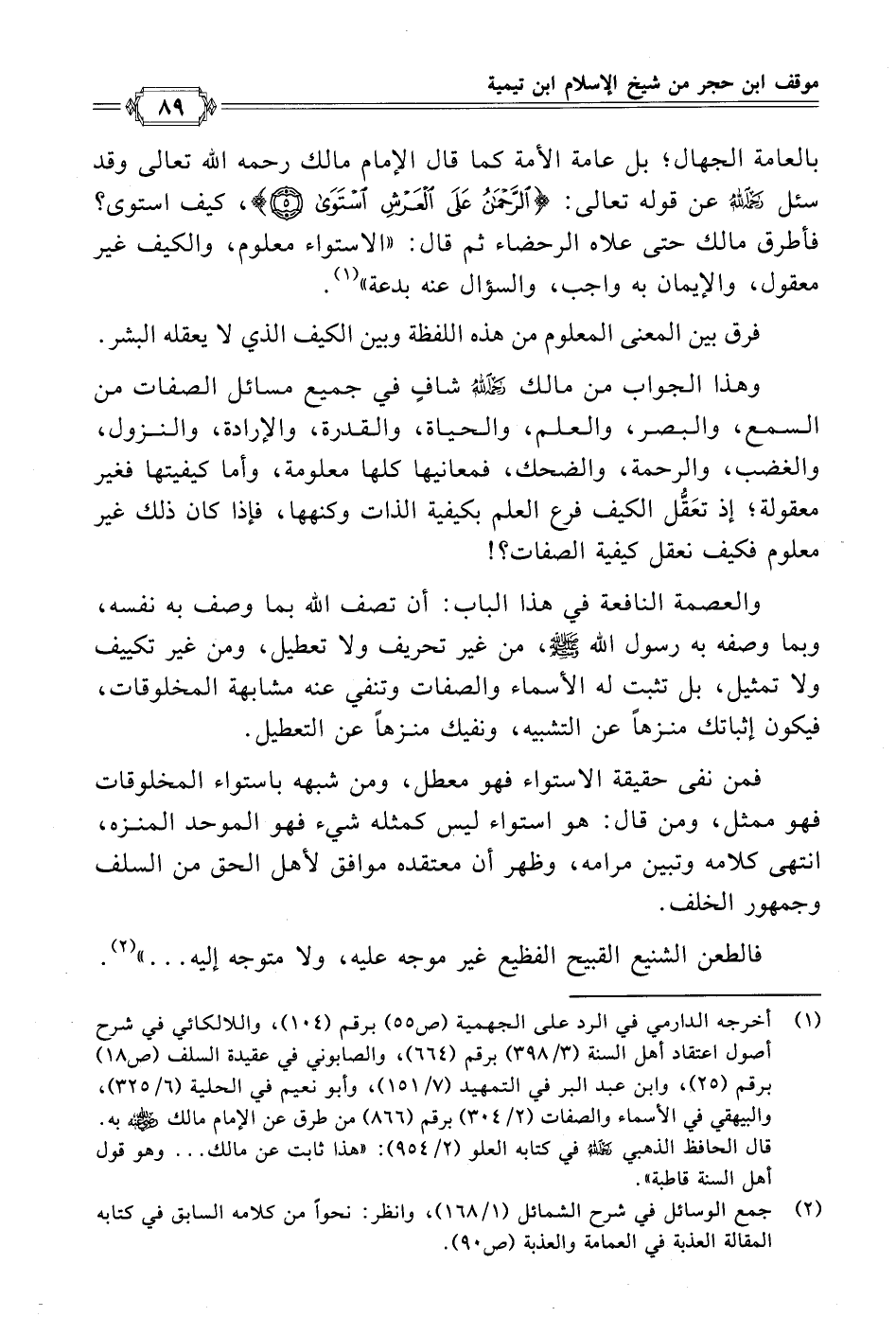 (¬١) أخرجه الدارمي في الرد على الجهمية (ص ٥٥) برقم (١٠٤)، واللالكائي في شرح أصول اعتقاد أهل السنة (٣/ ٣٩٨) برقم (٦٦٤)، والصابوني في عقيدة السلف (ص ١٨) برقم (٢٥)، وابن عبد البر في التمهيد (٧/ ١٥١)، وأبو نعيم في الحلية (٦/ ٣٢٥)، والبيهقي في الأسماء والصفات (٢/ ٣٠٤) برقم (٨٦٦) من طرق عن الإمام مالك - رضي الله عنه - به.