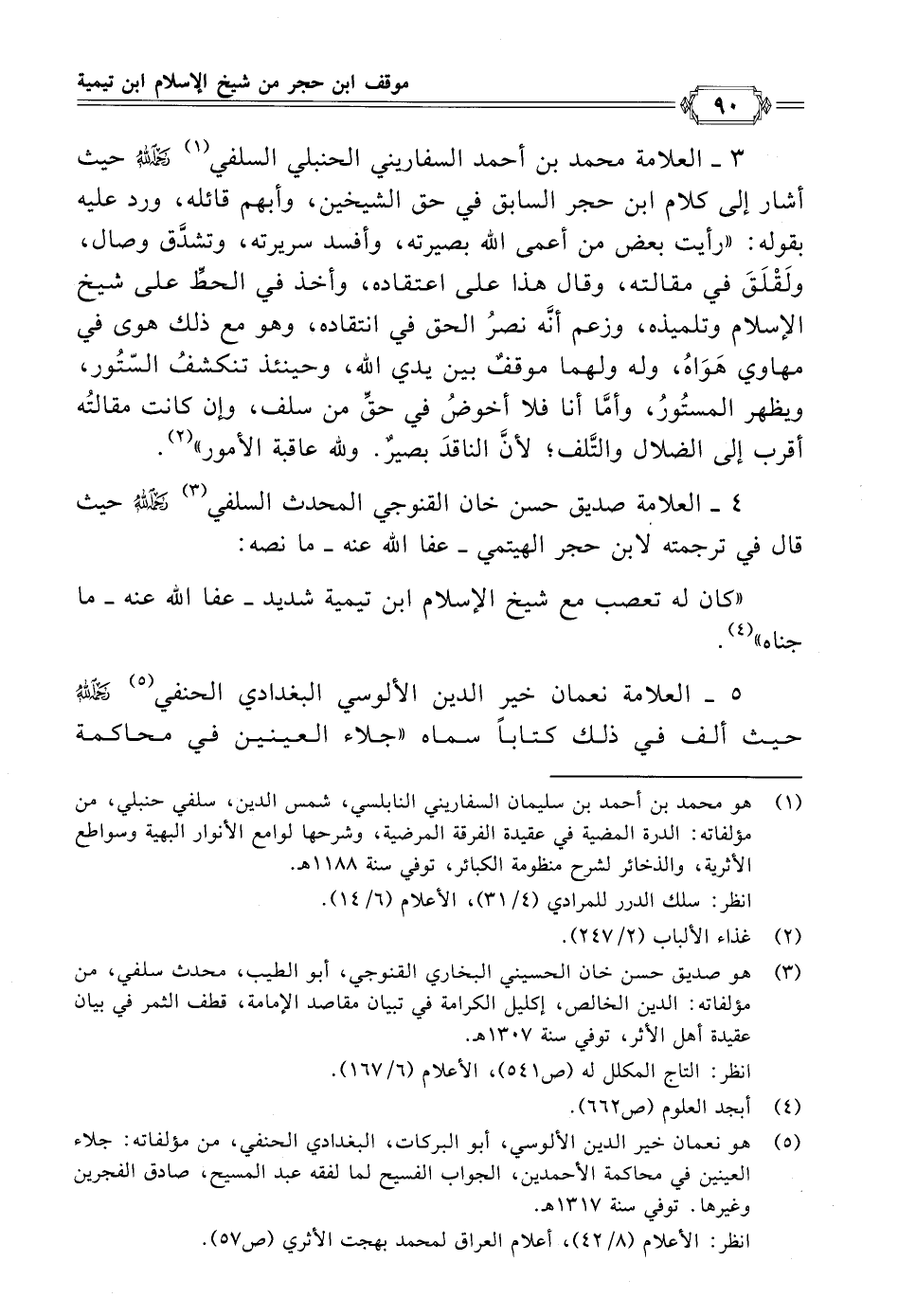 (¬٥) هو نعمان خير الدين الألوسي، أبو البركات، البغدادي الحنفي، من مؤلفاته: جلاء العينين في محاكمة الأحمدين، الجواب الفسيح لما لفقه عبد المسيح، صادق الفجرين وغيرها. توفي سنة ١٣١٧ هـ.