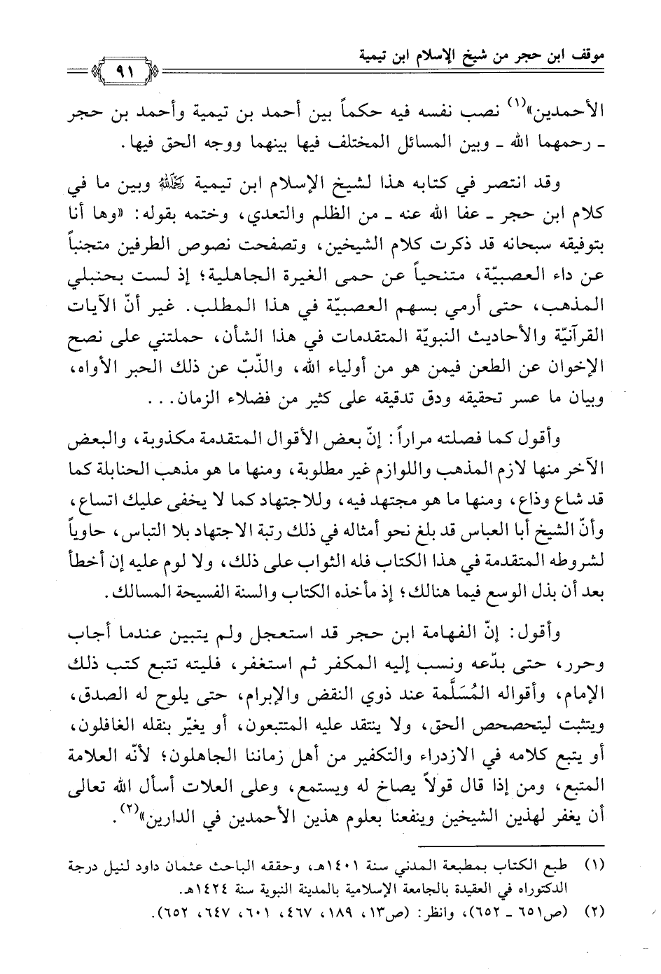 الأحمدين" (¬١) نصب نفسه فيه حكمًا بين أحمد بن تيمية وأحمد بن حجر - رحمهما الله - وبين المسائل المختلف فيها بينهما ووجه الحق فيها.