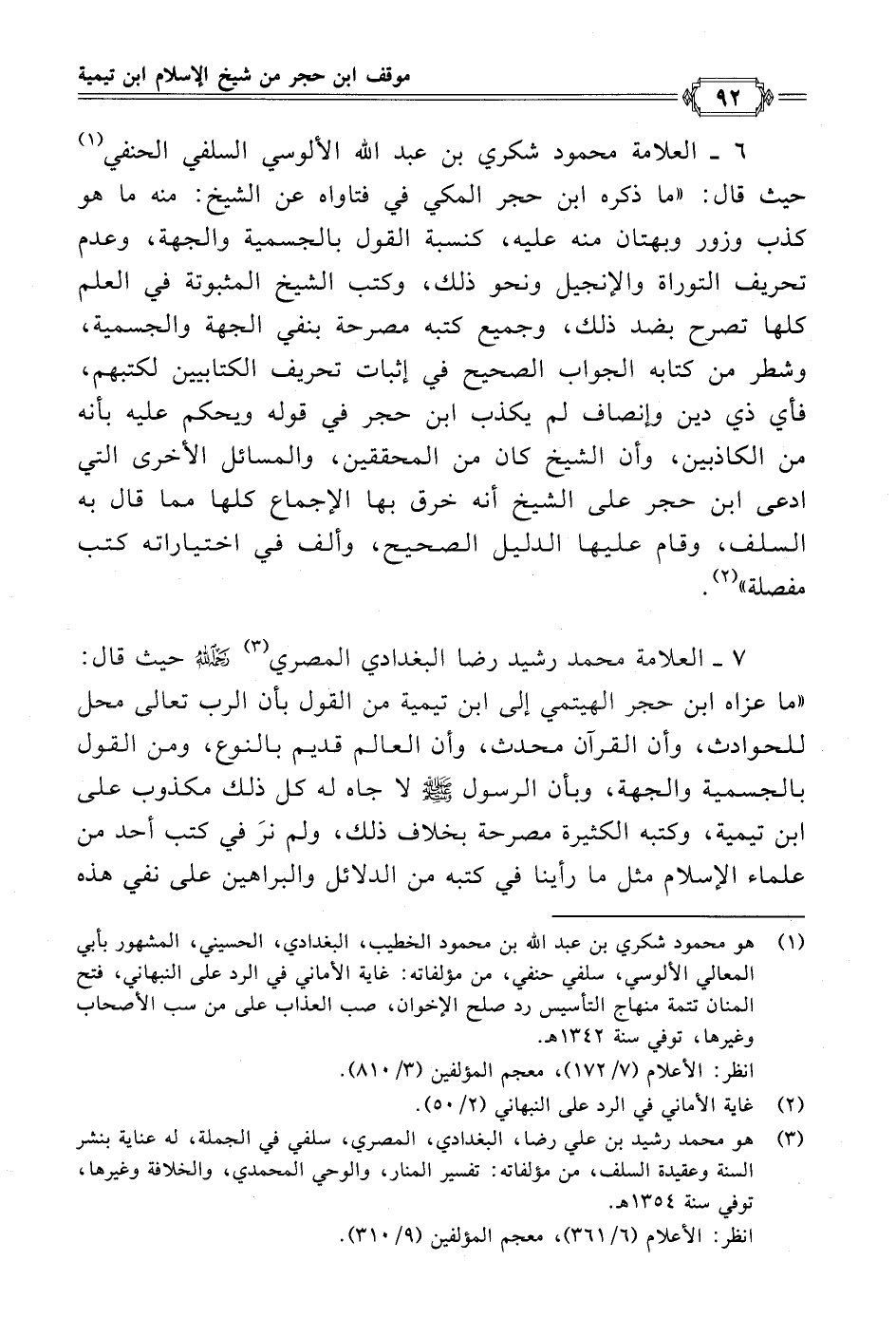 ٦ - العلامة محمود شكري بن عبد الله الألوسي السلفي الحنفي (¬١) حيث قال: "ما ذكره ابن حجر المكي في فتاواه عن الشيخ: منه ما هو كذب وزور وبهتان منه عليه، كنسبة القول بالجسمية والجهة، وعدم تحريف التوراة والإنجيل ونحو ذلك، وكتب الشيخ المثبوتة في العلم كلها تصرح بضد ذلك، وجميع كتبه مصرحة بنفي الجهة والجسمية، وشطر من كتابه الجواب الصحيح في إثبات تحريف الكتابيين لكتبهم، فأي ذي دين وإنصاف لم يكذب ابن حجر في قوله ويحكم عليه بأنه من الكاذبين، وأن الشيخ كان من المحققين، والمسائل الأخرى التي ادعى ابن حجر على الشيخ أنه خرق بها الإجماع كلها مما قال به السلف، وقام عليها الدليل الصحيح، وألف في اختياراته كتب مفصلة" (¬٢).