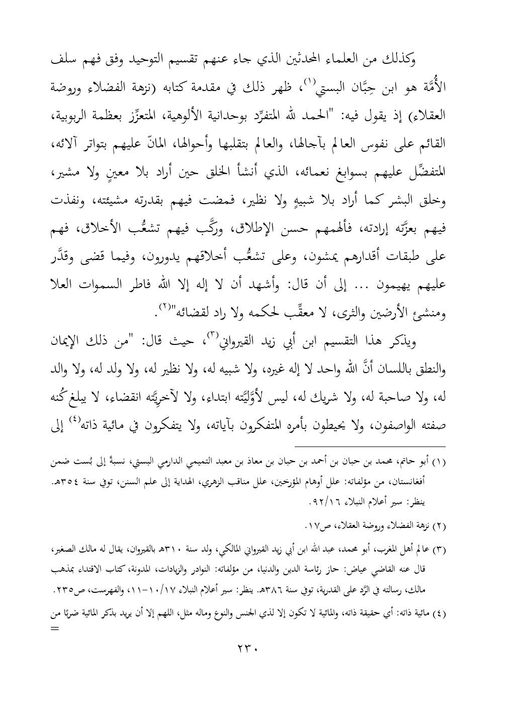 وكذلك من العلماء المحدثين الذي جاء عنهم تقسيم التوحيد وفق فهم سلف الأُمَّة هو ابن حِبَّان البستي (¬١)، ظهر ذلك في مقدمة كتابه (نزهة الفضلاء وروضة العقلاء) إذ يقول فيه: "الحمد لله المتفرِّد بوحدانية الألوهية، المتعزِّز بعظمة الربوبية، القائم على نفوس العالم بآجالها، والعالم بتقلبها وأحوالها، المانّ عليهم بتواتر آلائه، المتفضِّل عليهم بسوابغ نعمائه، الذي أنشأ الخلق حين أراد بلا معينٍ ولا مشير، وخلق البشر كما أراد بلا شبيهٍ ولا نظير، فمضت فيهم بقدرته مشيئته، ونفذت فيهم بعزَّته إرادته، فألهمهم حسن الإطلاق، وركَّب فيهم تشعُّب الأخلاق، فهم على طبقات أقدارهم يمشون، وعلى تشعُّب أخلاقهم يدورون، وفيما قضى وقدَّر عليهم يهيمون ... إلى أن قال: وأشهد أن لا إله إلا الله فاطر السموات العلا ومنشئ الأرضين والثرى، لا معقِّب لحكمه ولا راد لقضائه" (¬٢).