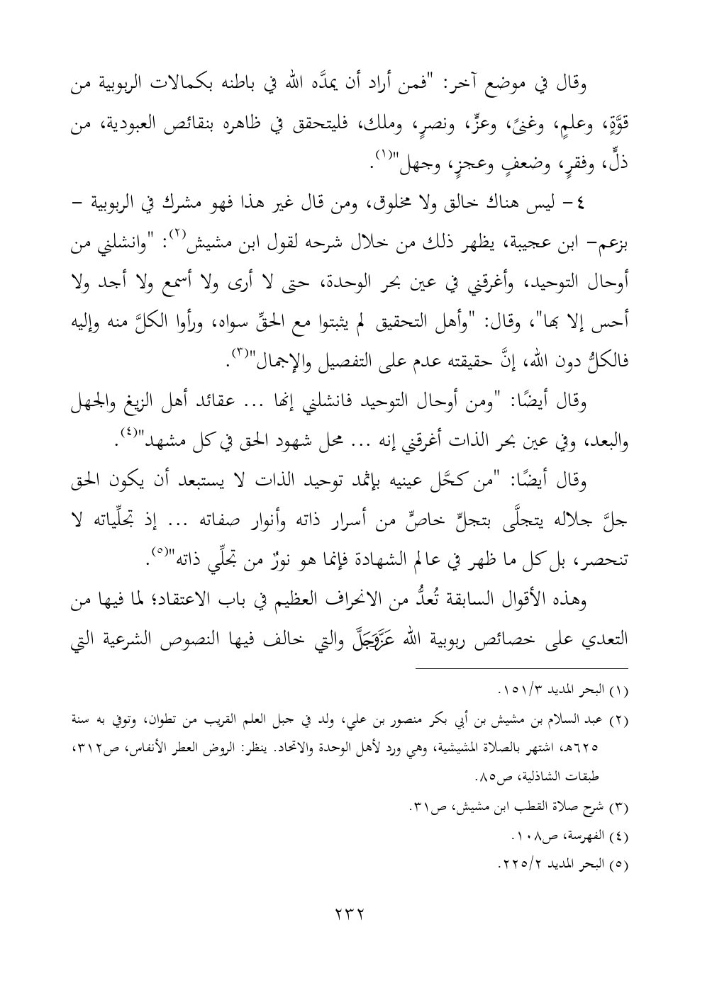 ٤ - ليس هناك خالق ولا مخلوق، ومن قال غير هذا فهو مشرك في الربوبية -بزعم- ابن عجيبة، يظهر ذلك من خلال شرحه لقول ابن مشيش (¬٢): "وانشلني من أوحال التوحيد، وأغرقني في عين بحر الوحدة، حتى لا أرى ولا أسمع ولا أجد ولا أحس إلا بها"، وقال: "وأهل التحقيق لم يثبتوا مع الحقِّ سواه، ورأوا الكلَّ منه وإليه فالكلُّ دون الله، إنَّ حقيقته عدم على التفصيل والإجمال" (¬٣).