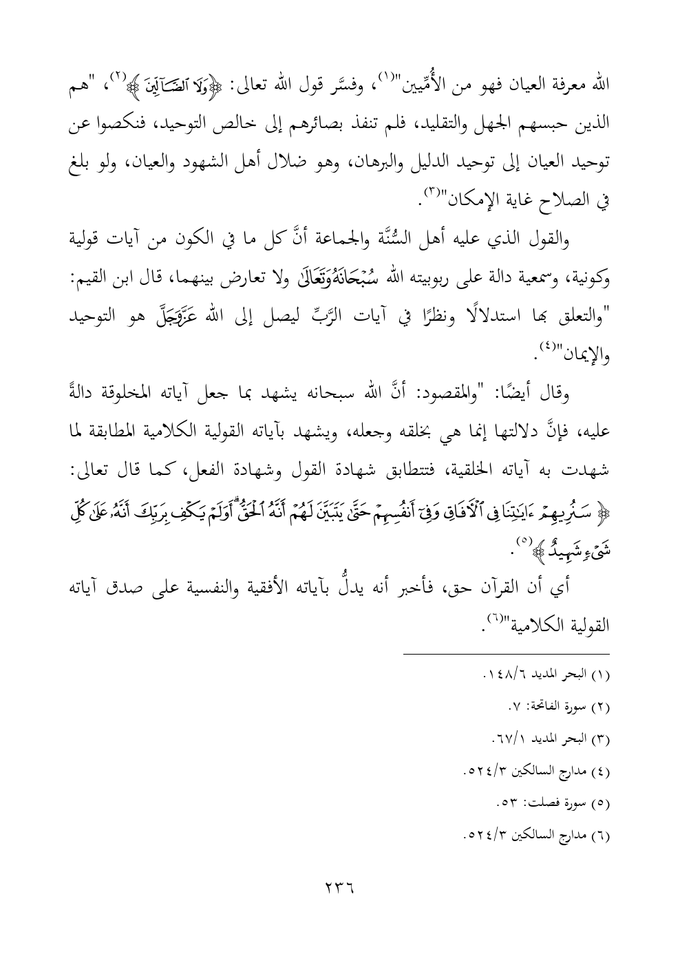 وقال أيضًا: "والمقصود: أنَّ الله سبحانه يشهد بما جعل آياته المخلوقة دالةً عليه، فإنَّ دلالتها إنما هي بخلقه وجعله، ويشهد بآياته القولية الكلامية المطابقة لما شهدت به آياته الخلقية، فتتطابق شهادة القول وشهادة الفعل، كما قال تعالى: {سَنُرِيهِمْ آيَاتِنَا فِي الْآفَاقِ وَفِي أَنْفُسِهِمْ حَتَّى يَتَبَيَّنَ لَهُمْ أَنَّهُ الْحَقُّ أَوَلَمْ يَكْفِ بِرَبِّكَ أَنَّهُ عَلَى كُلِّ شَيْءٍ شَهِيدٌ} (¬٥).