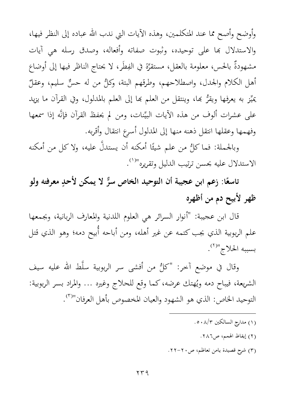 وقال في موضع آخر: "كلُّ من أفشى سر الربوبية سلَّط الله عليه سيف الشريعة، فيباح دمه ويُهتك عرضه، كما وقع للحلاج وغيره ... والمراد بسر الربوبية: التوحيد الخاص: الذي هو الشهود والعيان المخصوص بأهل العرفان" (¬٣).