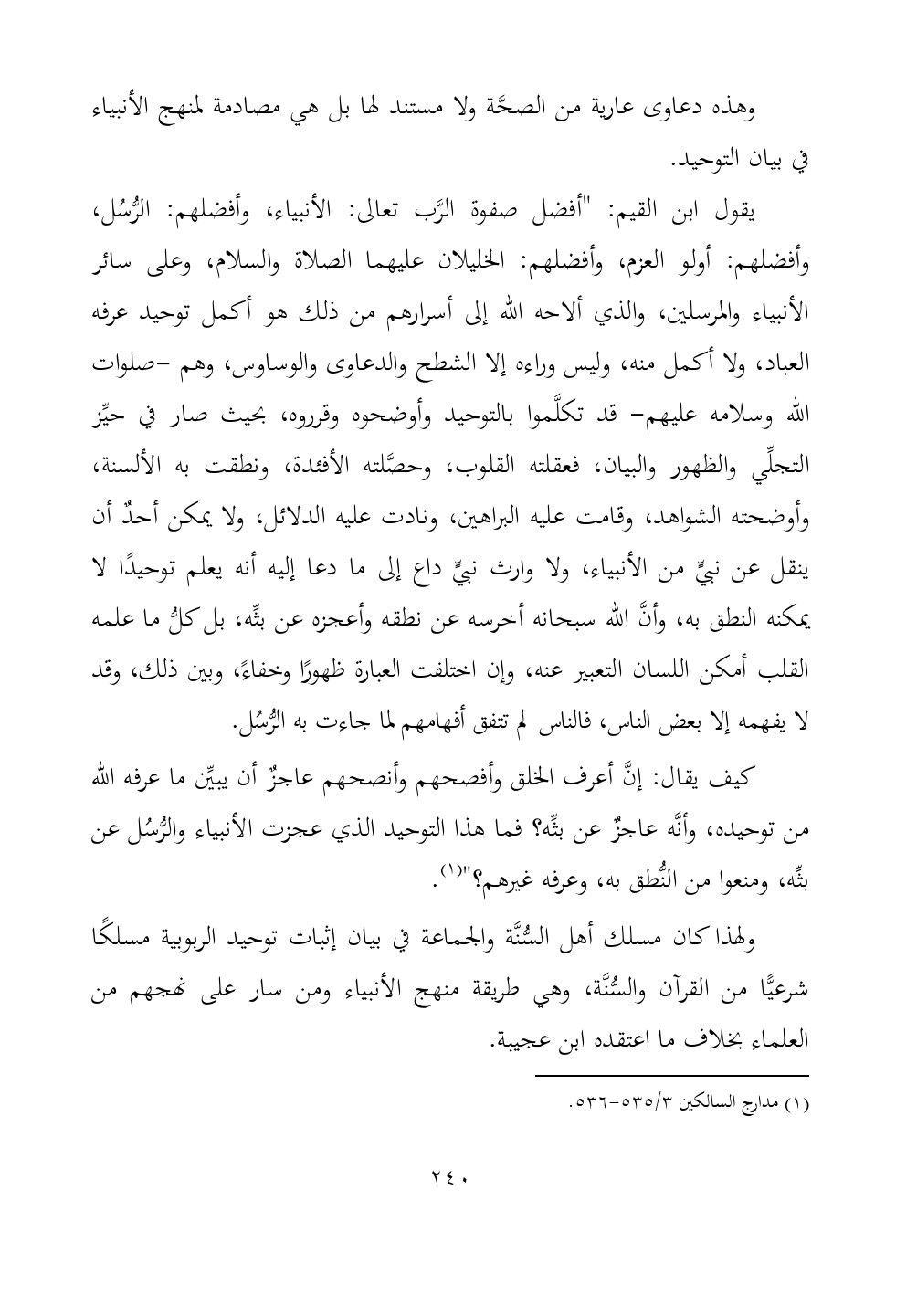 يقول ابن القيم: "أفضل صفوة الرَّب تعالى: الأنبياء، وأفضلهم: الرُّسُل، وأفضلهم: أولو العزم، وأفضلهم: الخليلان عليهما الصلاة والسلام، وعلى سائر الأنبياء والمرسلين، والذي ألاحه الله إلى أسرارهم من ذلك هو أكمل توحيد عرفه العباد، ولا أكمل منه، وليس وراءه إلا الشطح والدعاوى والوساوس، وهم -صلوات الله وسلامه عليهم- قد تكلَّموا بالتوحيد وأوضحوه وقرروه، بحيث صار في حيِّز التجلِّي والظهور والبيان، فعقلته القلوب، وحصَّلته الأفئدة، ونطقت به الألسنة، وأوضحته الشواهد، وقامت عليه البراهين، ونادت عليه الدلائل، ولا يمكن أحدٌ أن ينقل عن نبيٍّ من الأنبياء، ولا وارث نبيٍّ داع إلى ما دعا إليه أنه يعلم توحيدًا لا يمكنه النطق به، وأنَّ الله سبحانه أخرسه عن نطقه وأعجزه عن بثِّه، بل كلُّ ما علمه القلب أمكن اللسان التعبير عنه، وإن اختلفت العبارة ظهورًا وخفاءً، وبين ذلك، وقد لا يفهمه إلا بعض الناس، فالناس لم تتفق أفهامهم لما جاءت به الرُّسُل.