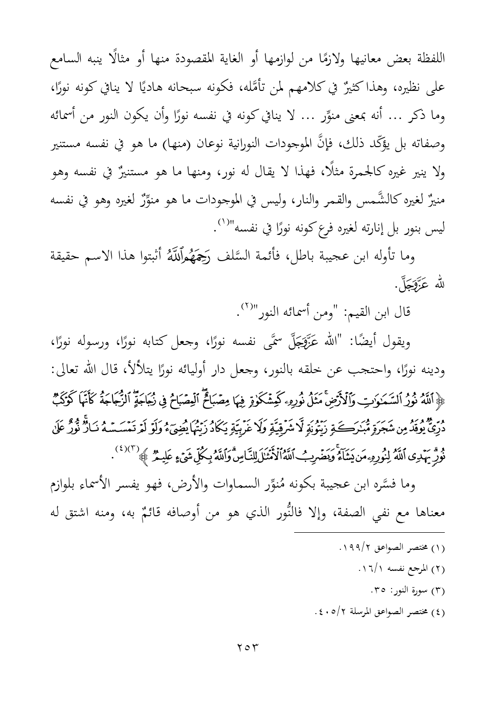 وما فسَّره ابن عجيبة بكونه مُنوِّر السماوات والأرض، فهو يفسر الأسماء بلوازم معناها مع نفي الصفة، وإلا فالنُّور الذي هو من أوصافه قائمٌ به، ومنه اشتق له
