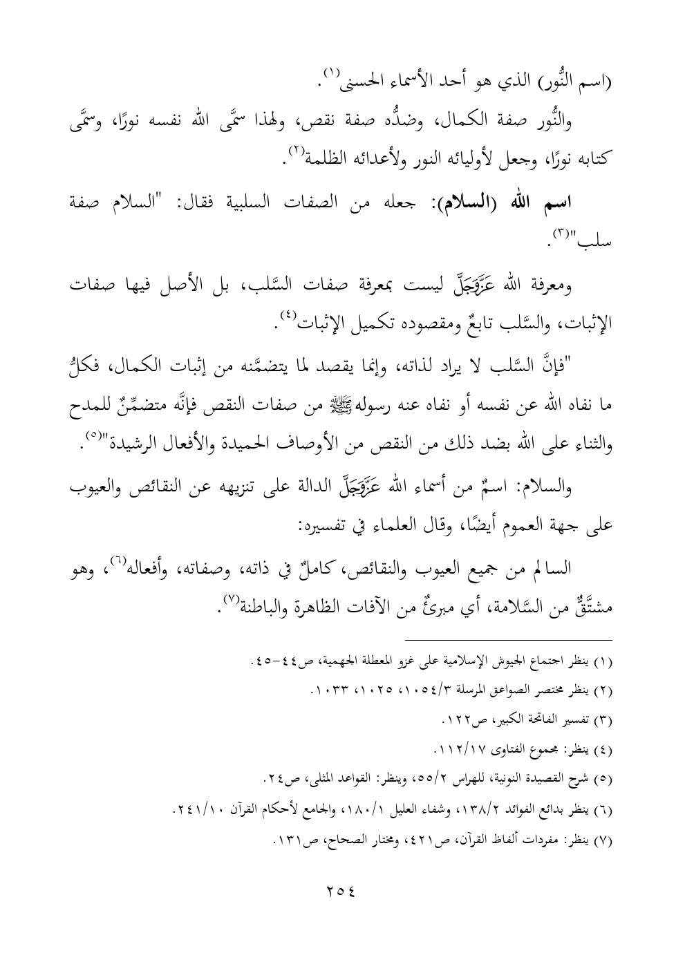 اسم الله (السلام): جعله من الصفات السلبية فقال: "السلام صفة سلب" (¬٣).