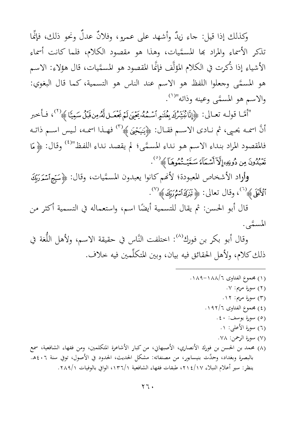 وقال أبو بكر بن فورك (¬٨): اختلفت النَّاس في حقيقة الاسم، ولأهل اللُّغة في ذلك كلام، ولأهل الحقائق فيه بيان، وبين المتكلِّمين فيه خلاف.