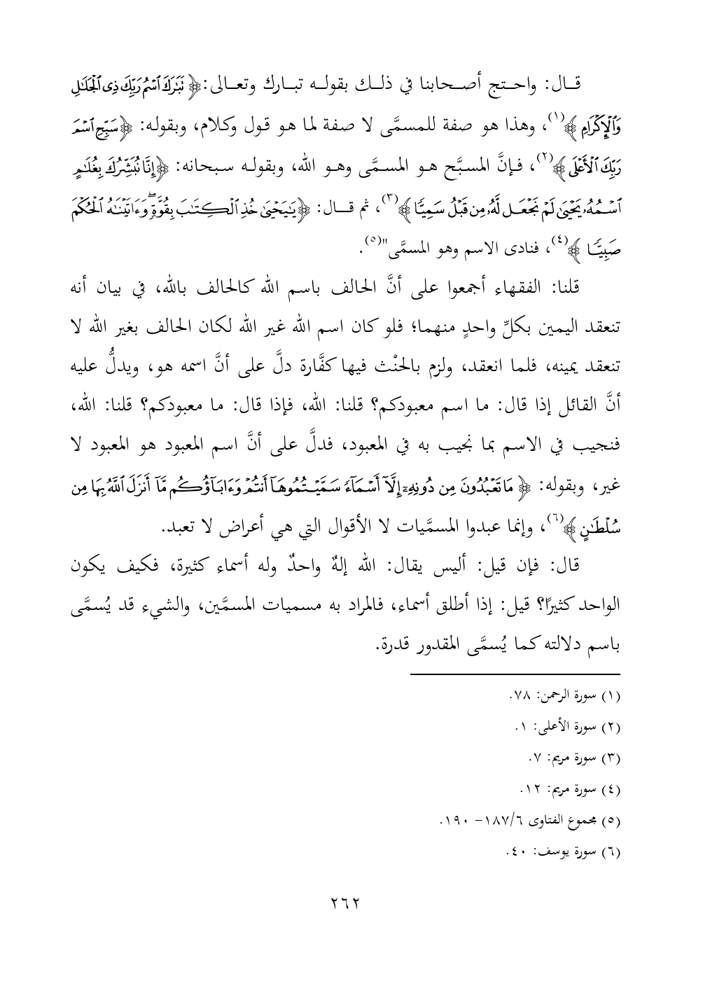 قال: واحتج أصحابنا في ذلك بقوله تبارك وتعالى: {تَبَارَكَ اسْمُ رَبِّكَ ذِي الْجَلَالِ وَالْإِكْرَامِ} (¬١)، وهذا هو صفة للمسمَّى لا صفة لما هو قول وكلام، وبقوله: {سَبِّحِ اسْمَ رَبِّكَ الْأَعْلَى} (¬٢)، فإنَّ المسبَّح هو المسمَّى وهو الله، وبقوله سبحانه: {إِنَّا نُبَشِّرُكَ بِغُلَامٍ اسْمُهُ يَحْيَى لَمْ نَجْعَلْ لَهُ مِنْ قَبْلُ سَمِيًّا} (¬٣)، ثم قال: {يَايَحْيَى خُذِ الْكِتَابَ بِقُوَّةٍ وَآتَيْنَاهُ الْحُكْمَ صَبِيًّا} (¬٤)، فنادى الاسم وهو المسمَّى" (¬٥).