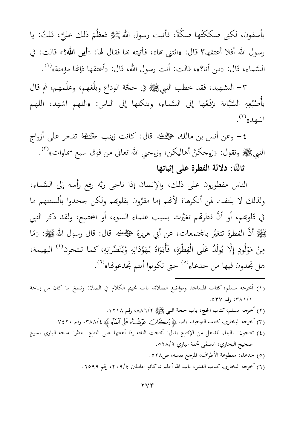 الناس مفطورون على ذلك، والإنسان إذا ناجى ربَّه رفع رأسه إلى السَّماء، ولذلك لا يلتفت لمن أنكرها؛ لأنهم إما مقرِّون بقلوبهم ولكن جحدوا بألسنتهم ما في قلوبهم، أو أنَّ فطرتهم تغيَّرت بسبب علماء السوء، أو المجتمع، ولقد ذكر النبي - صلى الله عليه وسلم - أنَّ الفطرة تتغيَّر بالمجتمعات، عن أبي هريرة - رضي الله عنه - قال: قال رسول الله - صلى الله عليه وسلم -: «مَا مِنْ مَوْلُودٍ إِلَّا يُولَدُ عَلَى الْفِطْرَةِ، فَأَبَوَاهُ يُهَوِّدَانِهِ وْيُنَصِّرانِهِ، كما تنتجون (¬٤) البهيمة، هل تجدون فيها من جدعاء (¬٥) حتى تكونوا أنتم تجدعونها» (¬٦).