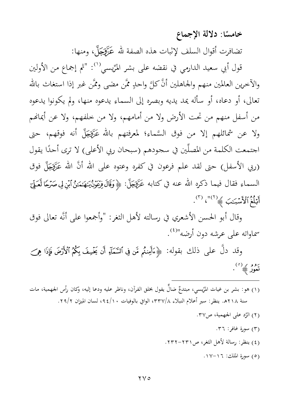 قول أبي سعيد الدارمي في نقضه على بشر المرِّيسي (¬١): "ثم إجماع من الأولين والآخرين العالمين منهم والجاهلين أنَّ كلَّ واحدٍ ممَّن مضى وممَّن غبر إذا استغاث بالله تعالى، أو دعاه، أو سأله يمد يديه وبصره إلى السماء يدعوه منها، ولم يكونوا يدعوه من أسفل منهم من تحت الأرض ولا من أمامهم، ولا من خلفهم، ولا عن أيمانهم ولا عن شمائلهم إلا من فوق السَّماء؛ لمعرفتهم بالله - عز وجل - أنه فوقهم، حتى اجتمعت الكلمة من المصلِّين في سجودهم (سبحان ربي الأعلى) لا ترى أحدًا يقول (ربي الأسفل) حتى لقد علم فرعون في كفره وعتوه على الله أنَّ الله - عز وجل - فوق السماء فقال فيما ذكره الله عنه في كتابه - عز وجل -: {وَقَالَ فِرْعَوْنُ يَاهَامَانُ ابْنِ لِي صَرْحًا لَعَلِّي أَبْلُغُ الْأَسْبَابَ} (¬٢) "، (¬٣).