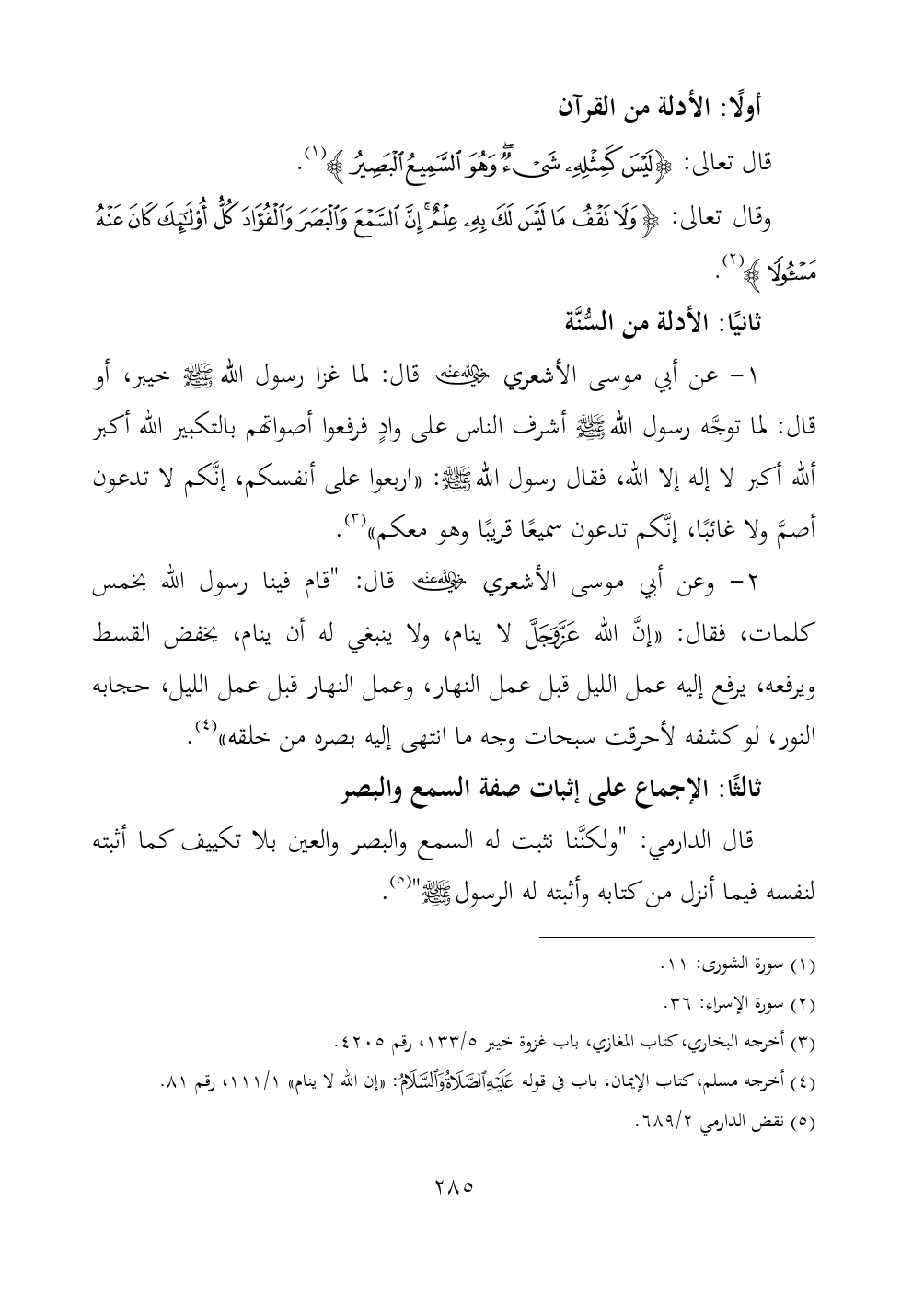 قال الدارمي: "ولكنَّنا نثبت له السمع والبصر والعين بلا تكييف كما أثبته لنفسه فيما أنزل من كتابه وأثبته له الرسول - صلى الله عليه وسلم - " (¬٥).