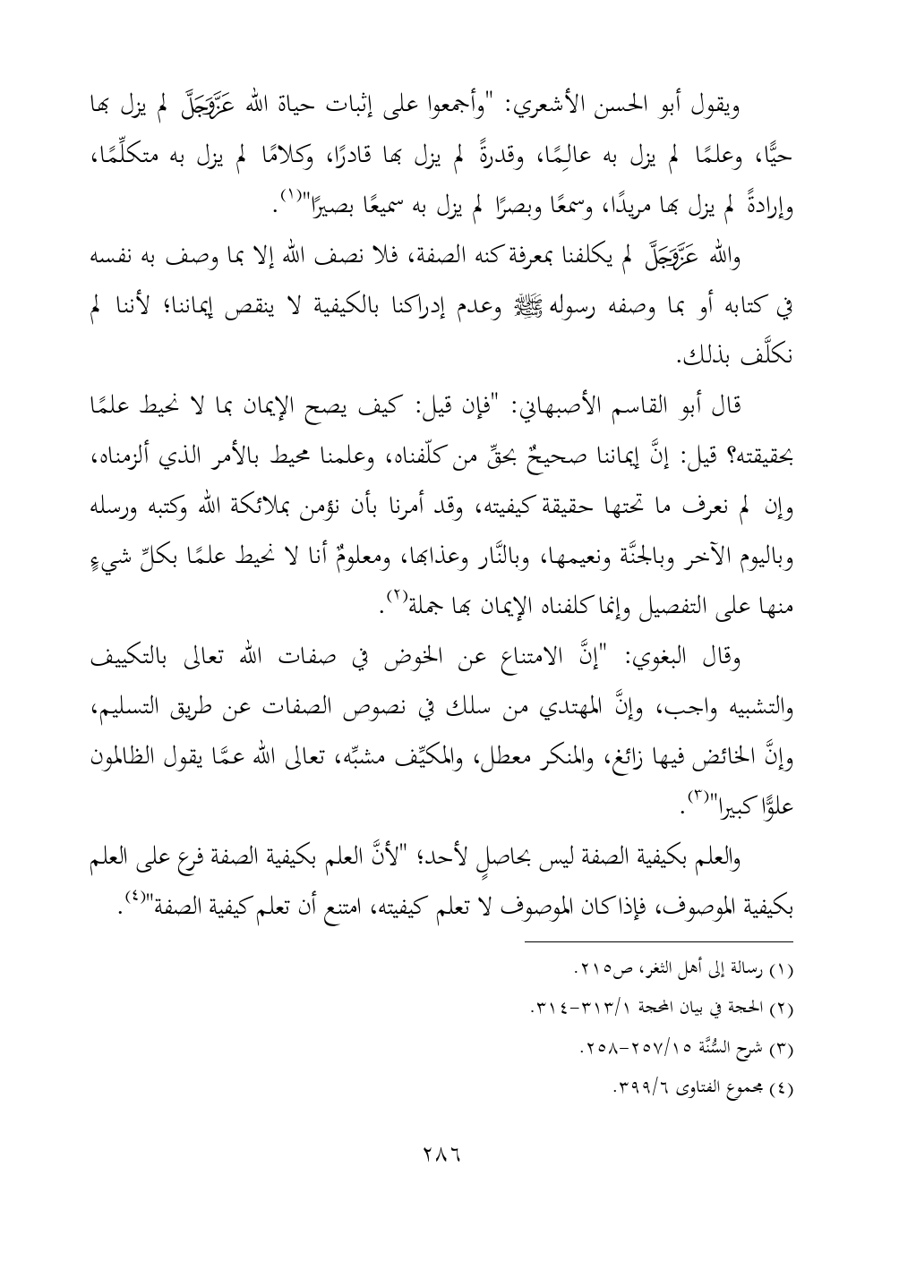 والعلم بكيفية الصفة ليس بحاصلٍ لأحد؛ "لأنَّ العلم بكيفية الصفة فرع على العلم بكيفية الموصوف، فإذا كان الموصوف لا تعلم كيفيته، امتنع أن تعلم كيفية الصفة" (¬٤).
