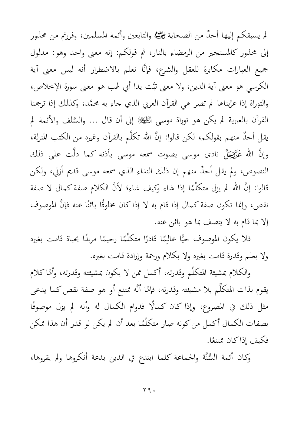 لم يسبقكم إليها أحدٌ من الصحابة - رضي الله عنهم - والتابعين وأئمة المسلمين، وفررتم من محذور إلى محذور كالمستجير من الرمضاء بالنار، ثم قولكم: إنه معنى واحد وهو: مدلول جميع العبارات مكابرة للعقل والشرع، فإنَّا نعلم بالاضطرار أنه ليس معنى آية الكرسي هو معنى آية الدين، ولا معنى تبَّت يدا أبي لهب هو معنى سورة الإخلاص، والتوراة إذا عرَّبناها لم تصر هي القرآن العربي الذي جاء به محمَّد، وكذلك إذا ترجمنا القرآن بالعبرية لم يكن هو توراة موسى - عليه السلام - إلى أن قال ... والسَّلف والأئمة لم يقل أحدٌ منهم بقولكم، لكن قالوا: إنَّ الله تكلَّم بالقرآن وغيره من الكتب المنزلة، وإنَّ الله - عز وجل - نادى موسى بصوت سمعه موسى بأذنه كما دلَّت على ذلك النصوص، ولم يقل أحدٌ منهم إن ذلك النداء الذي سمعه موسى قديم أزلي، ولكن قالوا: إنَّ الله لم يزل متكلِّمًا إذا شاء وكيف شاء؛ لأنَّ الكلام صفة كمال لا صفة نقص، وإنما تكون صفة كمال إذا قام به لا إذا كان مخلوقًا بائنًا عنه فإنَّ الموصوف إلا بما قام به لا يتصف بما هو بائن عنه.
