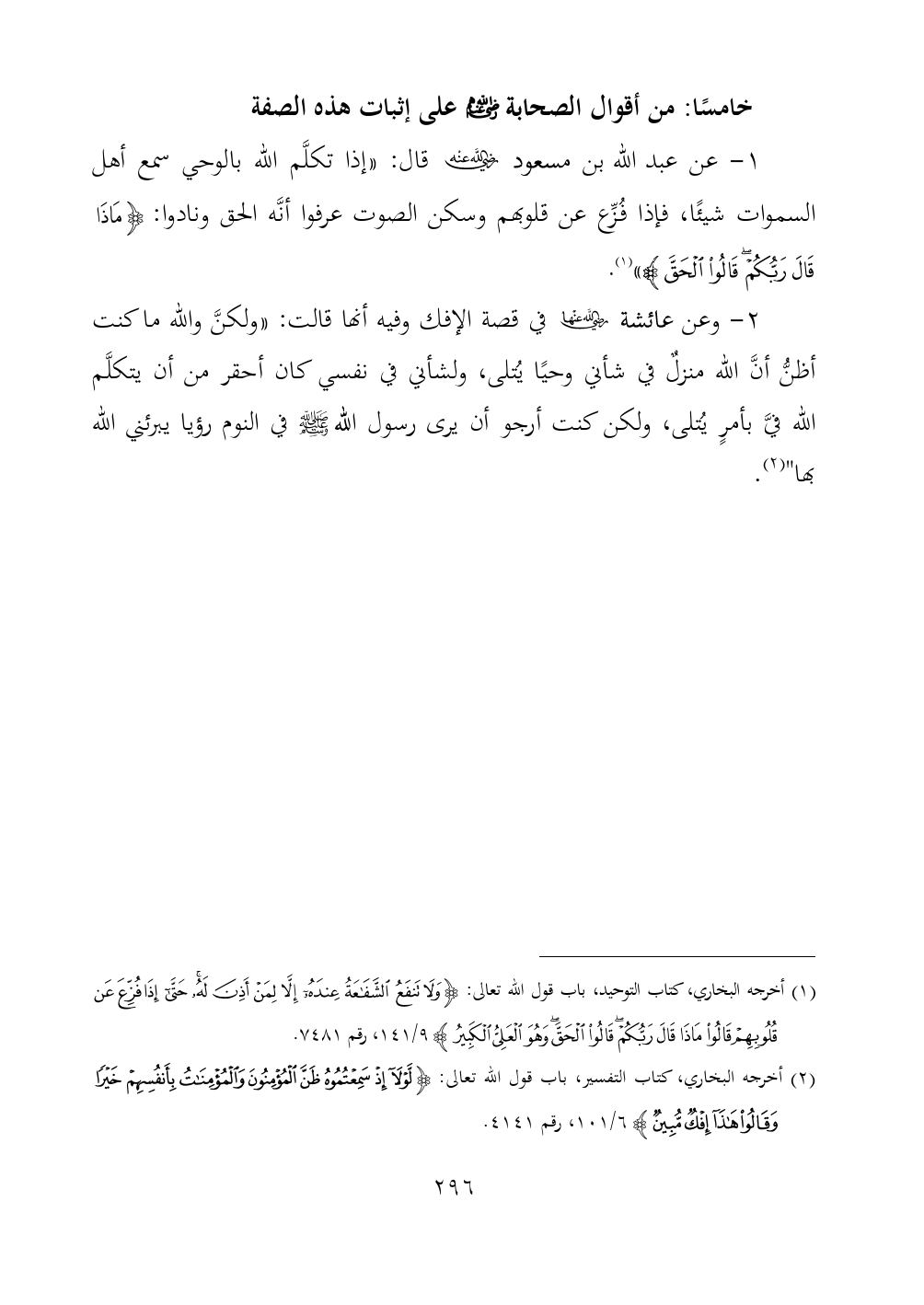 (¬١) أخرجه البخاري، كتاب التوحيد، باب قول الله تعالى: {وَلَا تَنْفَعُ الشَّفَاعَةُ عِنْدَهُ إِلَّا لِمَنْ أَذِنَ لَهُ حَتَّى إِذَا فُزِّعَ عَنْ قُلُوبِهِمْ قَالُوا مَاذَا قَالَ رَبُّكُمْ قَالُوا الْحَقَّ وَهُوَ الْعَلِيُّ الْكَبِيرُ} ٩/ ١٤١، رقم ٧٤٨١.
