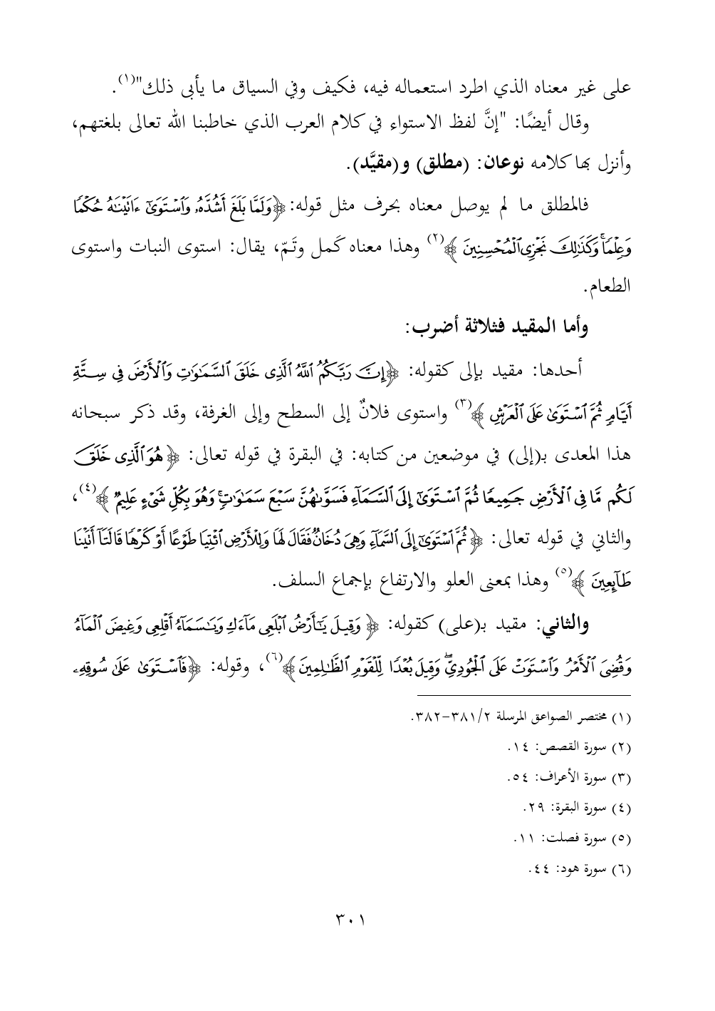 وقال أيضًا: "إنَّ لفظ الاستواء في كلام العرب الذي خاطبنا الله تعالى بلغتهم، وأنزل بها كلامه نوعان: (مطلق) و (مقيَّد).