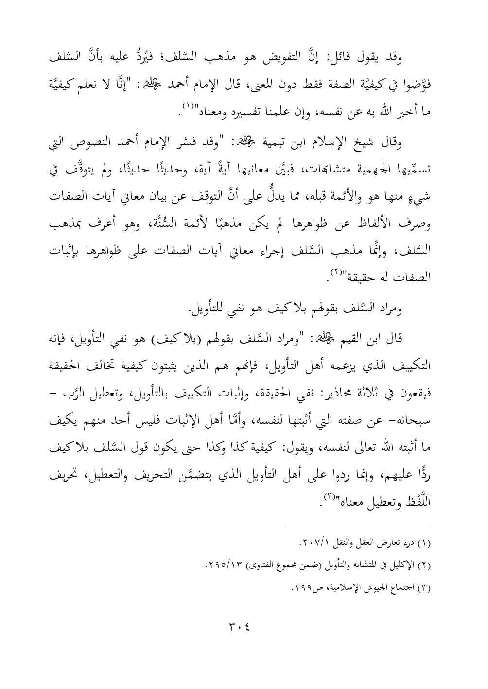 وقال شيخ الإسلام ابن تيمية - رحمه الله -: "وقد فسَّر الإمام أحمد النصوص التي تسمِّيها الجهمية متشابهات، فبيَّن معانيها آيةً آية، وحديثًا حديثًا، ولم يتوقَّف في شيءٍ منها هو والأئمة قبله، مما يدلُّ على أنَّ التوقف عن بيان معاني آيات الصفات وصرف الألفاظ عن ظواهرها لم يكن مذهبًا لأئمة السُّنَّة، وهو أعرف بمذهب السَّلف، وإنِّما مذهب السَّلف إجراء معاني آيات الصفات على ظواهرها بإثبات الصفات له حقيقة" (¬٢).