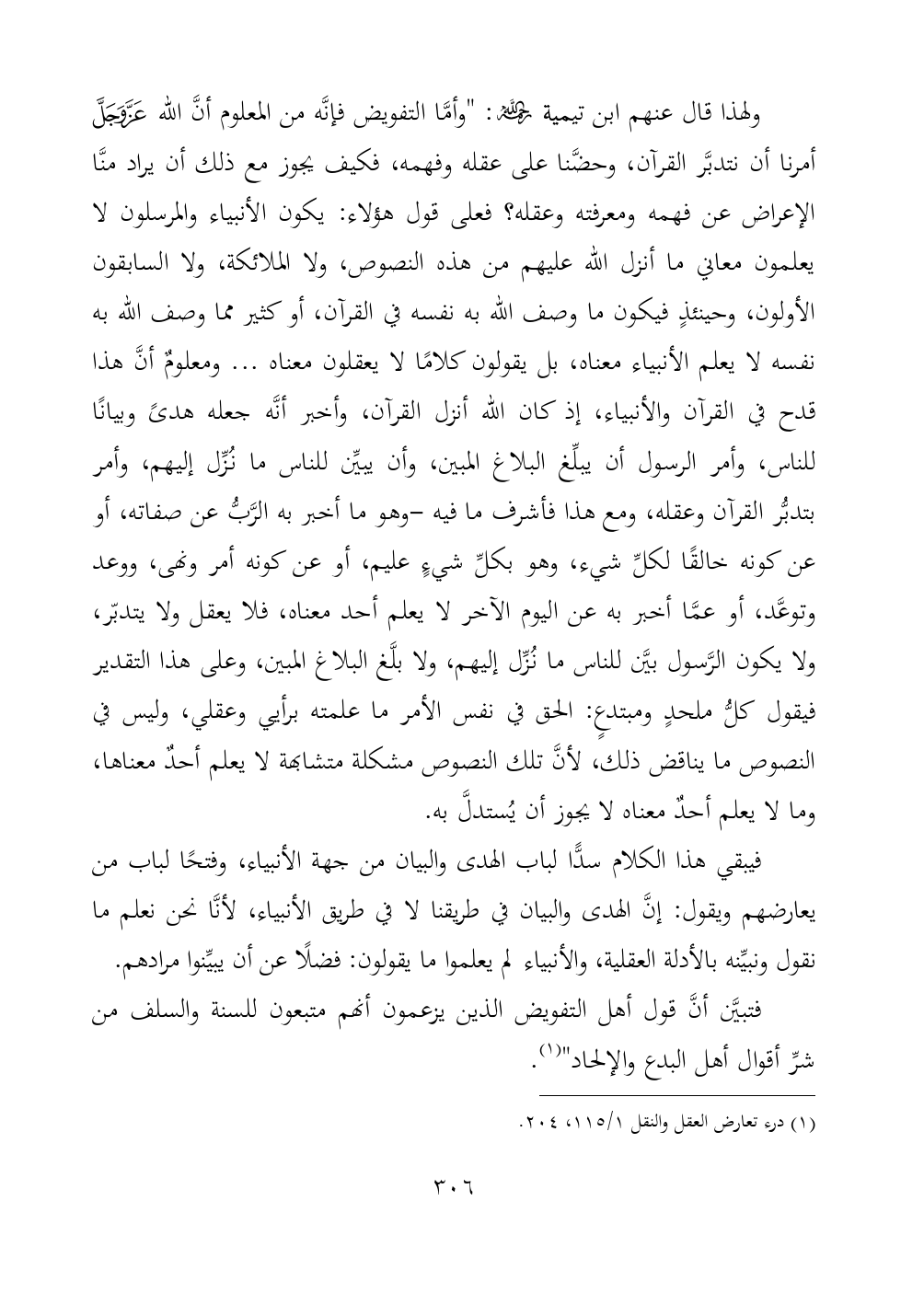 ولهذا قال عنهم ابن تيمية - رحمه الله -: "وأمَّا التفويض فإنَّه من المعلوم أنَّ الله - عز وجل - أمرنا أن نتدبَّر القرآن، وحضَّنا على عقله وفهمه، فكيف يجوز مع ذلك أن يراد منَّا الإعراض عن فهمه ومعرفته وعقله؟ فعلى قول هؤلاء: يكون الأنبياء والمرسلون لا يعلمون معاني ما أنزل الله عليهم من هذه النصوص، ولا الملائكة، ولا السابقون الأولون، وحينئذٍ فيكون ما وصف الله به نفسه في القرآن، أو كثير مما وصف الله به نفسه لا يعلم الأنبياء معناه، بل يقولون كلامًا لا يعقلون معناه ... ومعلومٌ أنَّ هذا قدح في القرآن والأنبياء، إذ كان الله أنزل القرآن، وأخبر أنَّه جعله هدىً وبيانًا للناس، وأمر الرسول أن يبلِّغ البلاغ المبين، وأن يبيِّن للناس ما نُزِّل إليهم، وأمر بتدبُّر القرآن وعقله، ومع هذا فأشرف ما فيه -وهو ما أخبر به الرَّبُّ عن صفاته، أو عن كونه خالقًا لكلِّ شيء، وهو بكلِّ شيءٍ عليم، أو عن كونه أمر ونهى، ووعد وتوعَّد، أو عمَّا أخبر به عن اليوم الآخر لا يعلم أحد معناه، فلا يعقل ولا يتدبّر، ولا يكون الرَّسول بيَّن للناس ما نُزِّل إليهم، ولا بلَّغ البلاغ المبين، وعلى هذا التقدير فيقول كلُّ ملحدٍ ومبتدعٍ: الحق في نفس الأمر ما علمته برأيي وعقلي، وليس في النصوص ما يناقض ذلك، لأنَّ تلك النصوص مشكلة متشابهة لا يعلم أحدٌ معناها، وما لا يعلم أحدٌ معناه لا يجوز أن يُستدلَّ به.