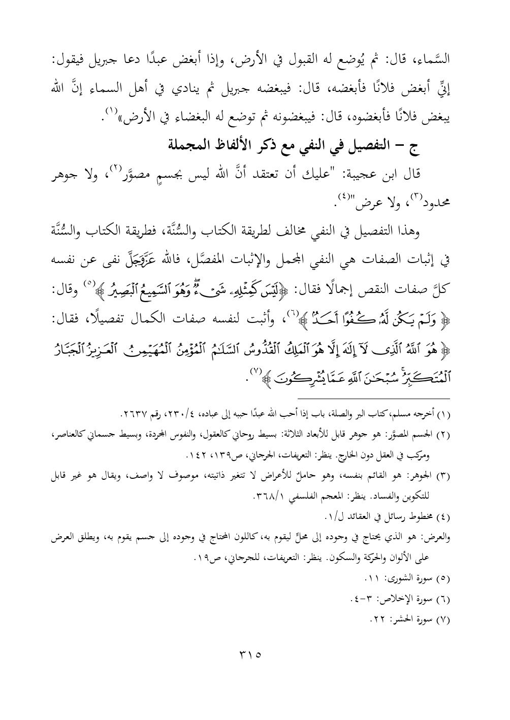 وهذا التفصيل في النفي مخالف لطريقة الكتاب والسُّنَّة، فطريقة الكتاب والسُّنَّة في إثبات الصفات هي النفي المجمل والإثبات المفصَّل، فالله - عز وجل - نفى عن نفسه كلَّ صفات النقص إجمالًا فقال: {لَيْسَ كَمِثْلِهِ شَيْءٌ وَهُوَ السَّمِيعُ الْبَصِيرُ} (¬٥) وقال: {وَلَمْ يَكُنْ لَهُ كُفُوًا أَحَدٌ} (¬٦)، وأثبت لنفسه صفات الكمال تفصيلًا، فقال: {هُوَ اللَّهُ الَّذِي لَا إِلَهَ إِلَّا هُوَ الْمَلِكُ الْقُدُّوسُ السَّلَامُ الْمُؤْمِنُ الْمُهَيْمِنُ الْعَزِيزُ الْجَبَّارُ الْمُتَكَبِّرُ سُبْحَانَ اللَّهِ عَمَّا يُشْرِكُونَ} (¬٧).