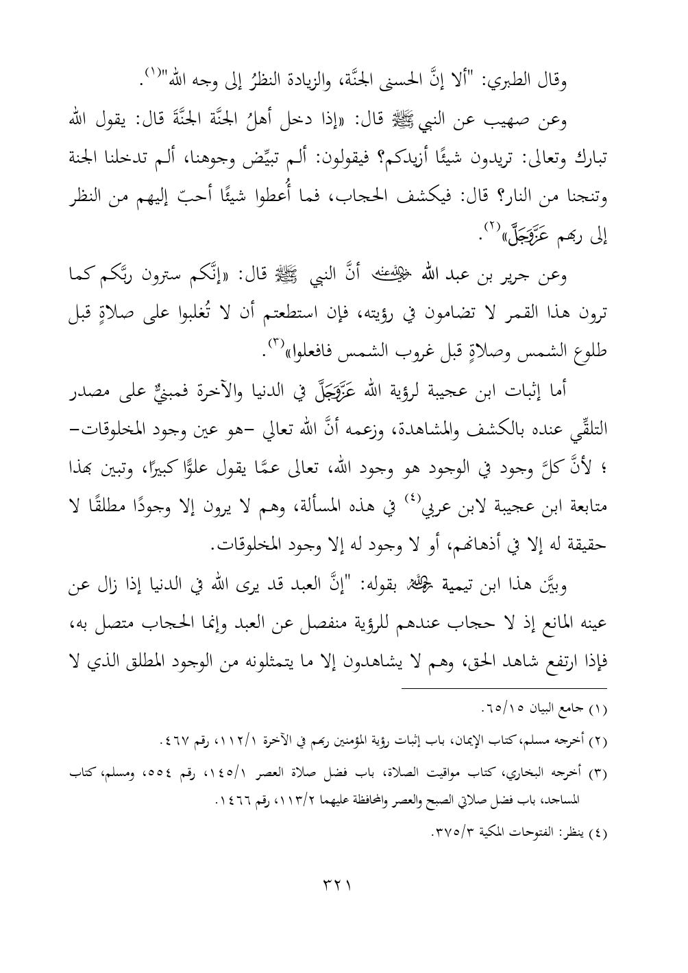 وعن صهيب عن النبي - صلى الله عليه وسلم - قال: «إذا دخل أهلُ الجنَّة الجنَّةَ قال: يقول الله تبارك وتعالى: تريدون شيئًا أزيدكم؟ فيقولون: ألم تبيِّض وجوهنا، ألم تدخلنا الجنة وتنجنا من النار؟ قال: فيكشف الحجاب، فما أُعطوا شيئًا أحبّ إليهم من النظر إلى ربهم - عز وجل -» (¬٢).