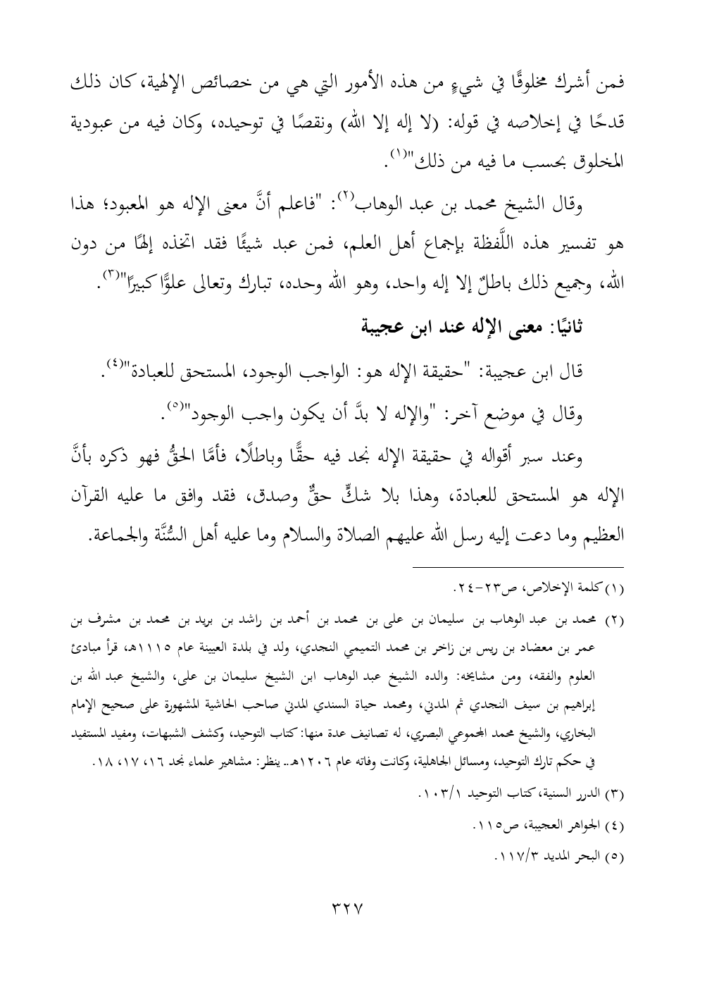 وقال الشيخ محمد بن عبد الوهاب (¬٢): "فاعلم أنَّ معنى الإله هو المعبود؛ هذا هو تفسير هذه اللَّفظة بإجماع أهل العلم، فمن عبد شيئًا فقد اتخذه إلهًا من دون الله، وجميع ذلك باطلٌ إلا إله واحد، وهو الله وحده، تبارك وتعالى علوًّا كبيرًا" (¬٣).