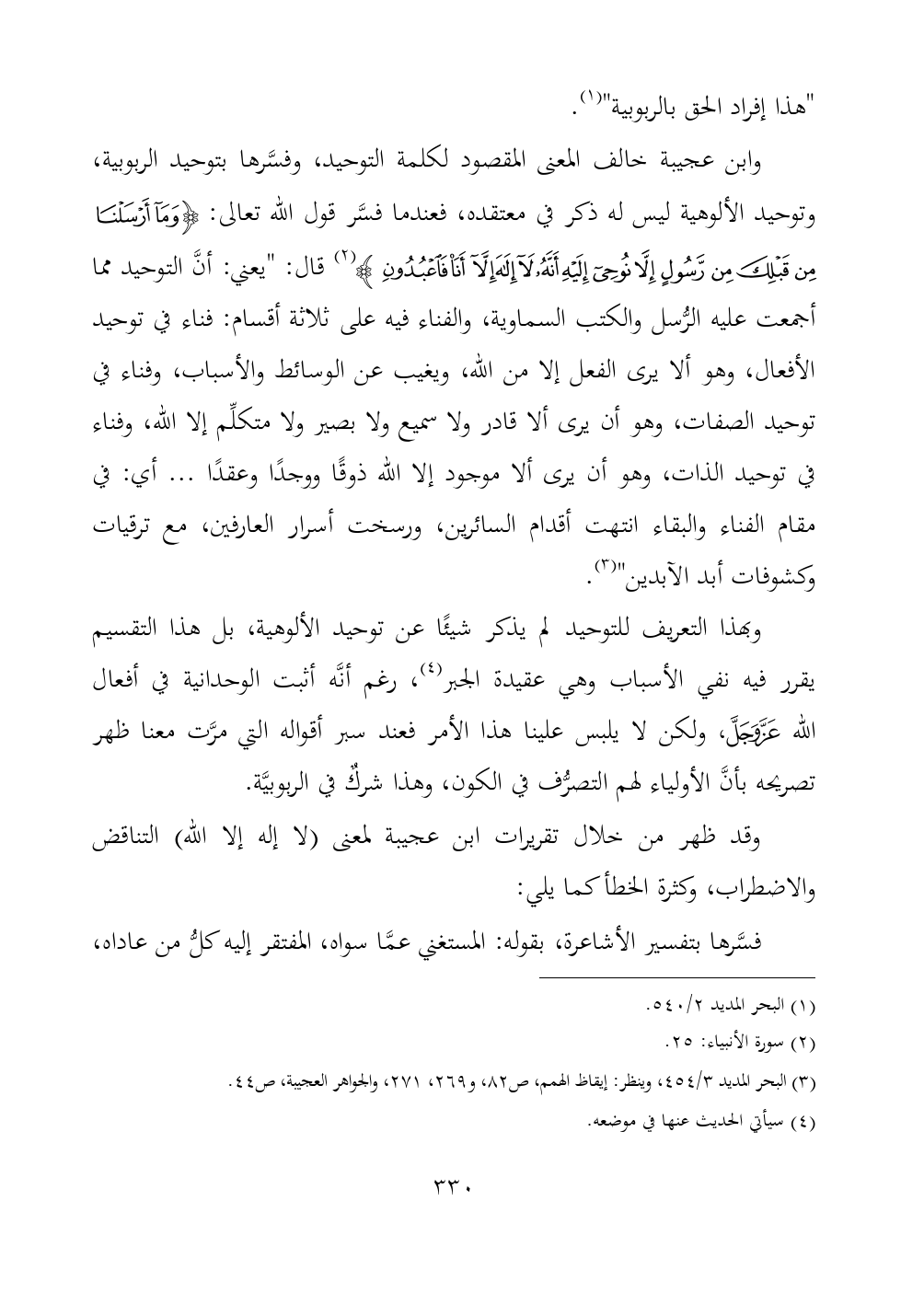 وابن عجيبة خالف المعنى المقصود لكلمة التوحيد، وفسَّرها بتوحيد الربوبية، وتوحيد الألوهية ليس له ذكر في معتقده، فعندما فسَّر قول الله تعالى: {وَمَا أَرْسَلْنَا مِنْ قَبْلِكَ مِنْ رَسُولٍ إِلَّا نُوحِي إِلَيْهِ أَنَّهُ لَا إِلَهَ إِلَّا أَنَا فَاعْبُدُونِ} (¬٢) قال: "يعني: أنَّ التوحيد مما أجمعت عليه الرُّسل والكتب السماوية، والفناء فيه على ثلاثة أقسام: فناء في توحيد الأفعال، وهو ألا يرى الفعل إلا من الله، ويغيب عن الوسائط والأسباب، وفناء في توحيد الصفات، وهو أن يرى ألا قادر ولا سميع ولا بصير ولا متكلِّم إلا الله، وفناء في توحيد الذات، وهو أن يرى ألا موجود إلا الله ذوقًا ووجدًا وعقدًا ... أي: في مقام الفناء والبقاء انتهت أقدام السائرين، ورسخت أسرار العارفين، مع ترقيات وكشوفات أبد الآبدين" (¬٣).