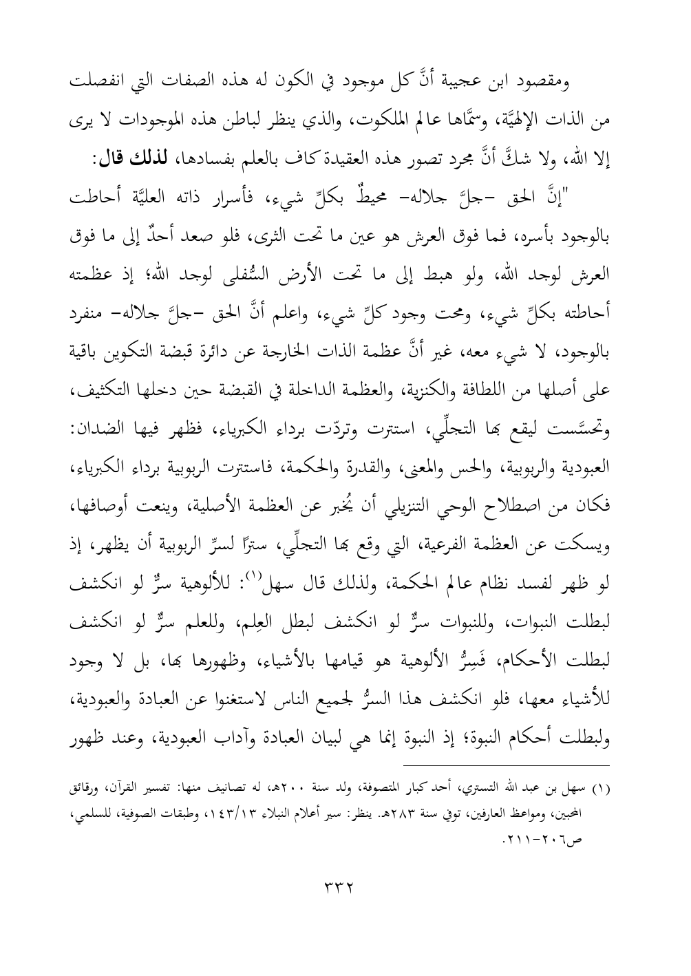 "إنَّ الحق -جلَّ جلاله- محيطٌ بكلِّ شيء، فأسرار ذاته العليَّة أحاطت بالوجود بأسره، فما فوق العرش هو عين ما تحت الثرى، فلو صعد أحدٌ إلى ما فوق العرش لوجد الله، ولو هبط إلى ما تحت الأرض السُّفلى لوجد الله؛ إذ عظمته أحاطته بكلِّ شيء، ومحت وجود كلِّ شيء، واعلم أنَّ الحق -جلَّ جلاله- منفرد بالوجود، لا شيء معه، غير أنَّ عظمة الذات الخارجة عن دائرة قبضة التكوين باقية على أصلها من اللطافة والكنزية، والعظمة الداخلة في القبضة حين دخلها التكثيف، وتحسَّست ليقع بها التجلِّي، استترت وتردّت برداء الكبرياء، فظهر فيها الضدان: العبودية والربوبية، والحس والمعنى، والقدرة والحكمة، فاستترت الربوبية برداء الكبرياء، فكان من اصطلاح الوحي التنزيلي أن يُخبر عن العظمة الأصلية، وينعت أوصافها، ويسكت عن العظمة الفرعية، التي وقع بها التجلِّي، سترًا لسرِّ الربوبية أن يظهر، إذ لو ظهر لفسد نظام عالم الحكمة، ولذلك قال سهل (¬١): للألوهية سرٌّ لو انكشف لبطلت النبوات، وللنبوات سرٌّ لو انكشف لبطل العِلم، وللعلم سرٌّ لو انكشف لبطلت الأحكام، فَسِرُّ الألوهية هو قيامها بالأشياء، وظهورها بها، بل لا وجود للأشياء معها، فلو انكشف هذا السرُّ لجميع الناس لاستغنوا عن العبادة والعبودية، ولبطلت أحكام النبوة؛ إذ النبوة إنما هي لبيان العبادة وآداب العبودية، وعند ظهور