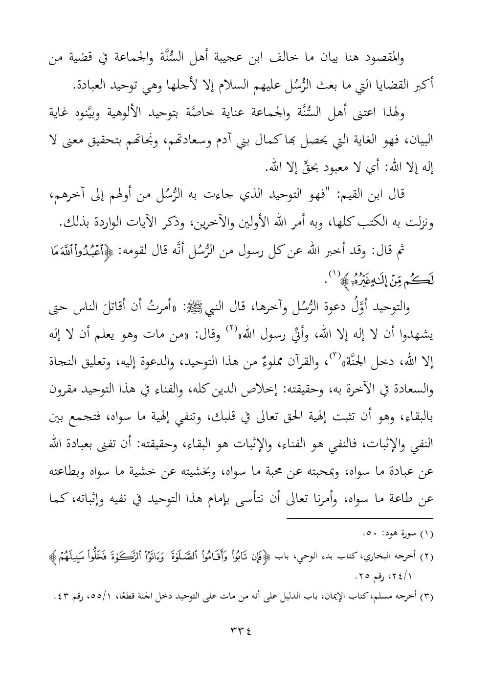 قال ابن القيم: "فهو التوحيد الذي جاءت به الرُّسُل من أولهم إلى آخرهم، ونزلت به الكتب كلها، وبه أمر الله الأولين والآخرين، وذكر الآيات الواردة بذلك.
