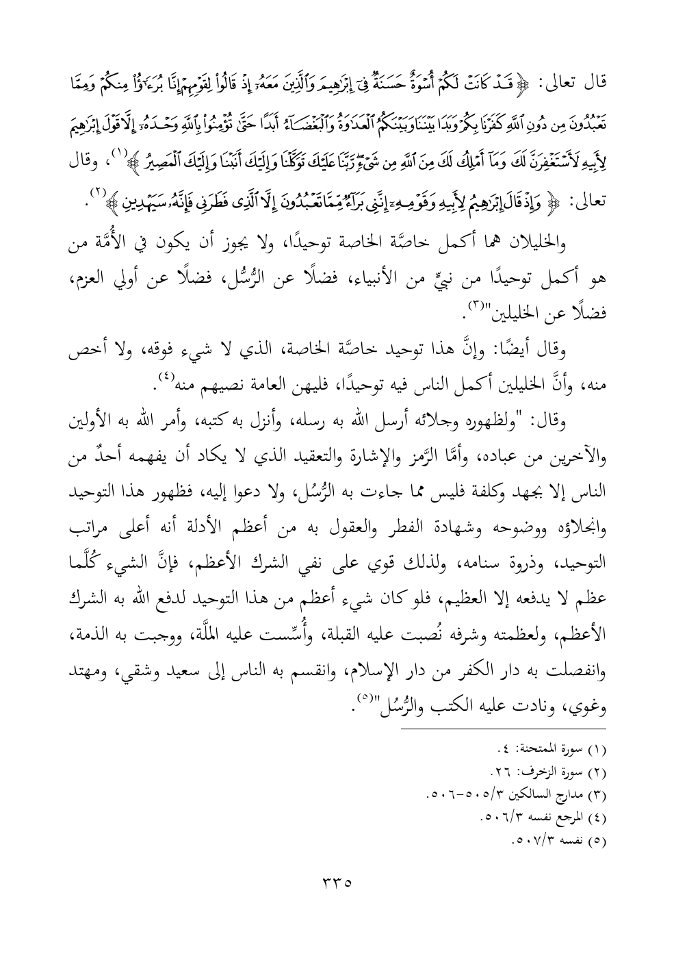 والخليلان هما أكمل خاصَّة الخاصة توحيدًا، ولا يجوز أن يكون في الأُمَّة من هو أكمل توحيدًا من نبيٍّ من الأنبياء، فضلًا عن الرُّسُّل، فضلًا عن أولي العزم، فضلًا عن الخليلين" (¬٣).