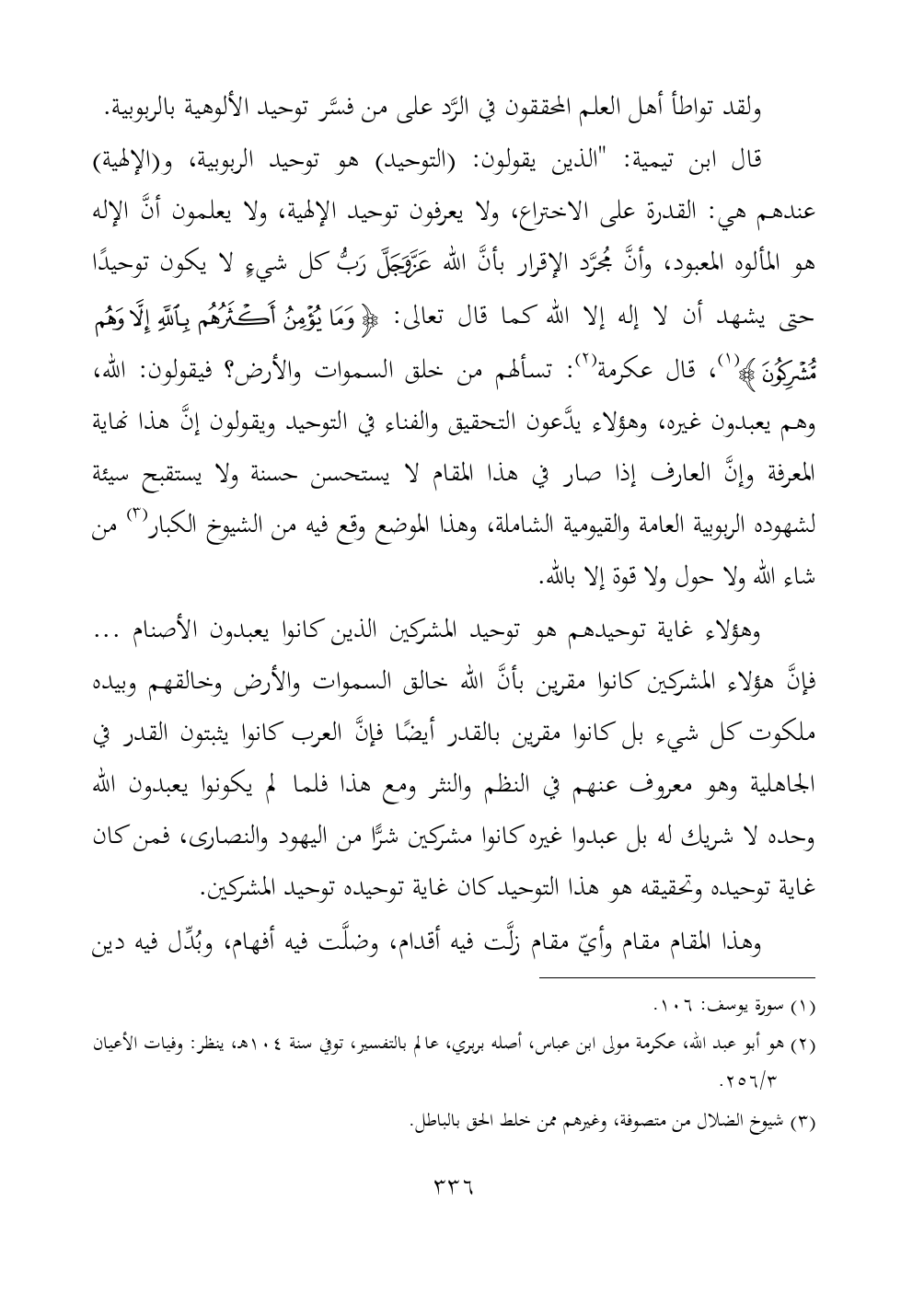 قال ابن تيمية: "الذين يقولون: (التوحيد) هو توحيد الربوبية، و (الإلهية) عندهم هي: القدرة على الاختراع، ولا يعرفون توحيد الإلهية، ولا يعلمون أنَّ الإله هو المألوه المعبود، وأنَّ مُجرَّد الإقرار بأنَّ الله - عز وجل - رَبُّ كل شيءٍ لا يكون توحيدًا حتى يشهد أن لا إله إلا الله كما قال تعالى: {وَمَا يُؤْمِنُ أَكْثَرُهُمْ بِاللَّهِ إِلَّا وَهُمْ مُشْرِكُونَ} (¬١)، قال عكرمة (¬٢): تسألهم من خلق السموات والأرض؟ فيقولون: الله، وهم يعبدون غيره، وهؤلاء يدَّعون التحقيق والفناء في التوحيد ويقولون إنَّ هذا نهاية المعرفة وإنَّ العارف إذا صار في هذا المقام لا يستحسن حسنة ولا يستقبح سيئة لشهوده الربوبية العامة والقيومية الشاملة، وهذا الموضع وقع فيه من الشيوخ الكبار (¬٣) من شاء الله ولا حول ولا قوة إلا بالله.