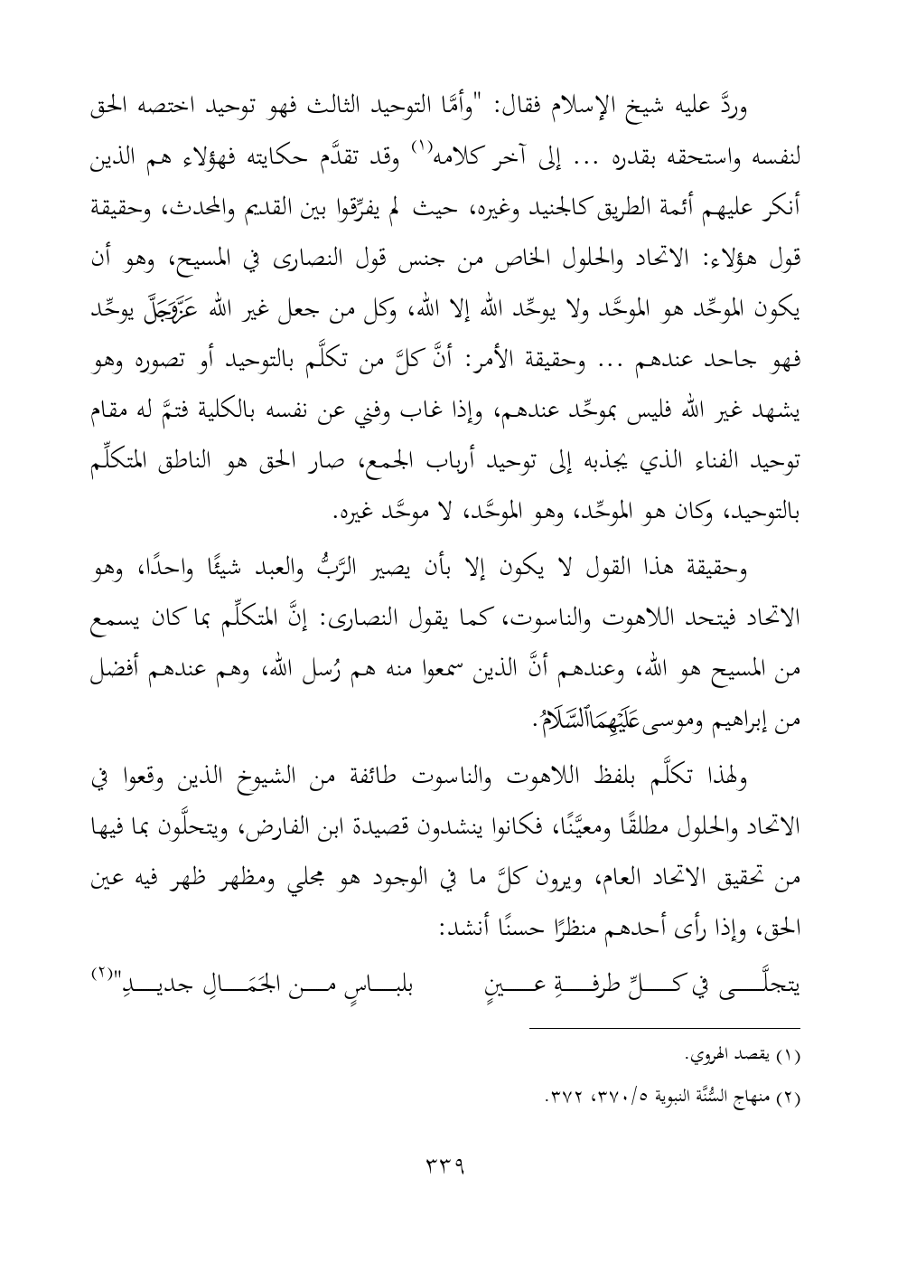 وردَّ عليه شيخ الإسلام فقال: "وأمَّا التوحيد الثالث فهو توحيد اختصه الحق لنفسه واستحقه بقدره ... إلى آخر كلامه (¬١) وقد تقدَّم حكايته فهؤلاء هم الذين أنكر عليهم أئمة الطريق كالجنيد وغيره، حيث لم يفرِّقوا بين القديم والمحدث، وحقيقة قول هؤلاء: الاتحاد والحلول الخاص من جنس قول النصارى في المسيح، وهو أن يكون الموحِّد هو الموحَّد ولا يوحِّد الله إلا الله، وكل من جعل غير الله - عز وجل - يوحِّد فهو جاحد عندهم ... وحقيقة الأمر: أنَّ كلَّ من تكلَّم بالتوحيد أو تصوره وهو يشهد غير الله فليس بموحِّد عندهم، وإذا غاب وفني عن نفسه بالكلية فتمَّ له مقام توحيد الفناء الذي يجذبه إلى توحيد أرباب الجمع، صار الحق هو الناطق المتكلِّم بالتوحيد، وكان هو الموحِّد، وهو الموحَّد، لا موحَّد غيره.