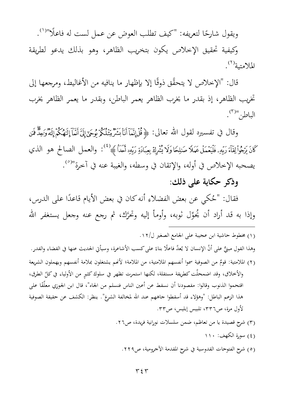 وكيفية تحقيق الإخلاص يكون بتخريب الظاهر، وهو بذلك يدعو لطريقة الملامتية (¬٢).