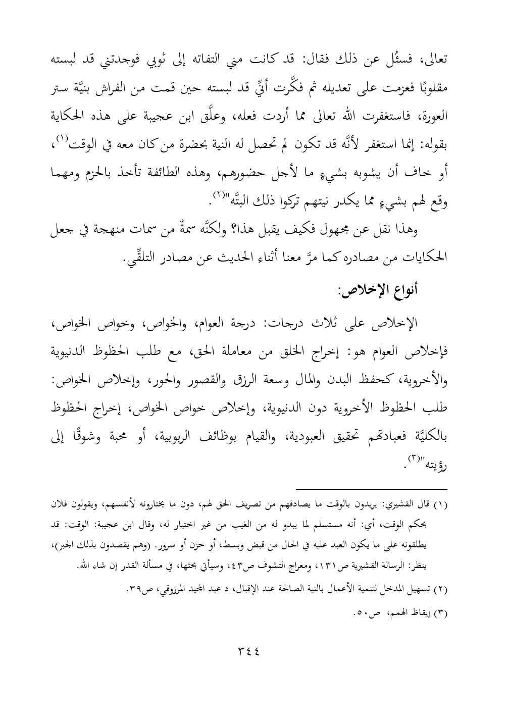 الإخلاص على ثلاث درجات: درجة العوام، والخواص، وخواص الخواص، فإخلاص العوام هو: إخراج الخلق من معاملة الحق، مع طلب الحظوظ الدنيوية والأخروية، كحفظ البدن والمال وسعة الرزق والقصور والحور، وإخلاص الخواص: طلب الحظوظ الأخروية دون الدنيوية، وإخلاص خواص الخواص، إخراج الحظوظ بالكليَّة فعبادتهم تحقيق العبودية، والقيام بوظائف الربوبية، أو محبة وشوقًا إلى رؤيته" (¬٣).