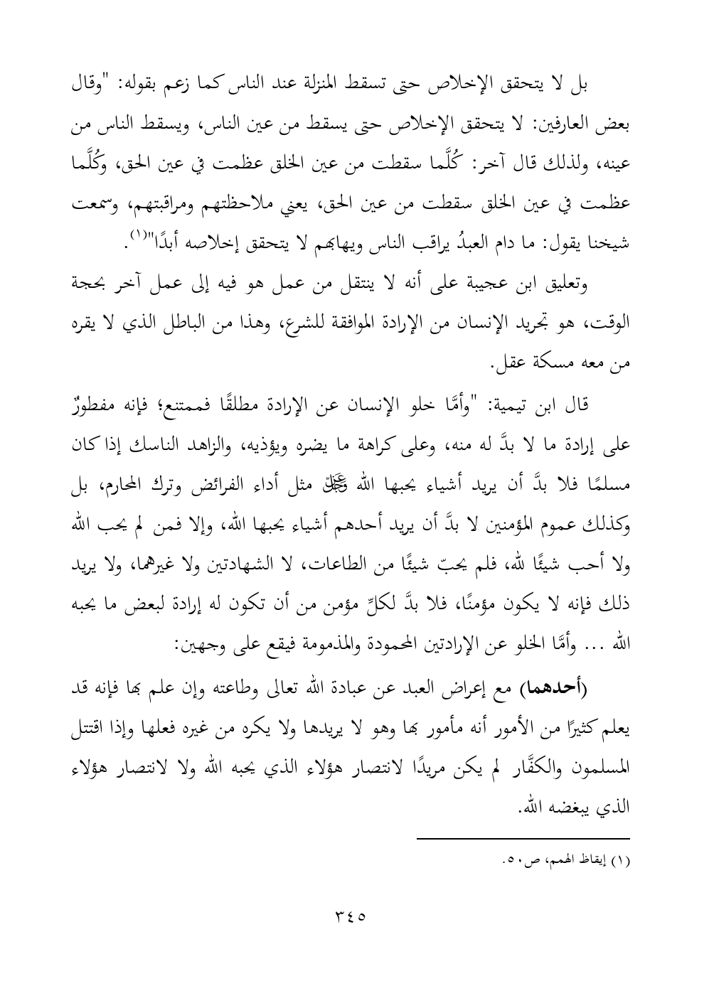 قال ابن تيمية: "وأمَّا خلو الإنسان عن الإرادة مطلقًا فممتنع؛ فإنه مفطورٌ على إرادة ما لا بدَّ له منه، وعلى كراهة ما يضره ويؤذيه، والزاهد الناسك إذا كان مسلمًا فلا بدَّ أن يريد أشياء يحبها الله - عز وجل - مثل أداء الفرائض وترك المحارم، بل وكذلك عموم المؤمنين لا بدَّ أن يريد أحدهم أشياء يحبها الله، وإلا فمن لم يحب الله ولا أحب شيئًا لله، فلم يحبّ شيئًا من الطاعات، لا الشهادتين ولا غيرهما، ولا يريد ذلك فإنه لا يكون مؤمنًا، فلا بدَّ لكلِّ مؤمن من أن تكون له إرادة لبعض ما يحبه الله ... وأمَّا الخلو عن الإرادتين المحمودة والمذمومة فيقع على وجهين: