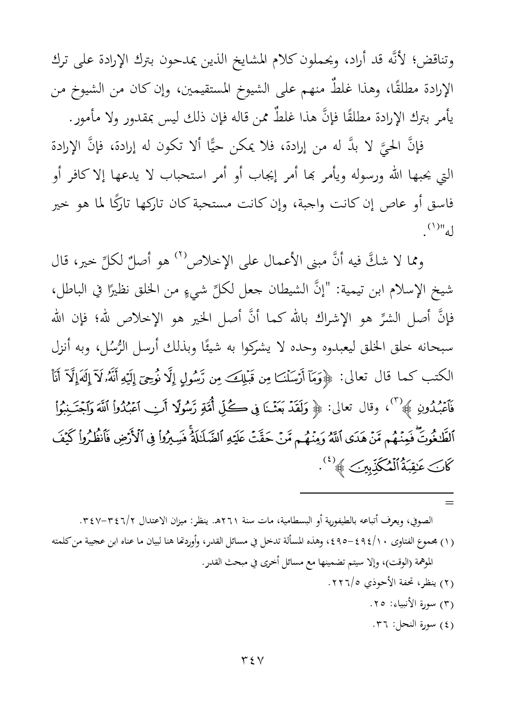 وتناقض؛ لأنَّه قد أراد، ويحملون كلام المشايخ الذين يمدحون بترك الإرادة على ترك الإرادة مطلقًا، وهذا غلطٌ منهم على الشيوخ المستقيمين، وإن كان من الشيوخ من يأمر بترك الإرادة مطلقًا فإنَّ هذا غلطٌ ممن قاله فإن ذلك ليس بمقدور ولا مأمور.
