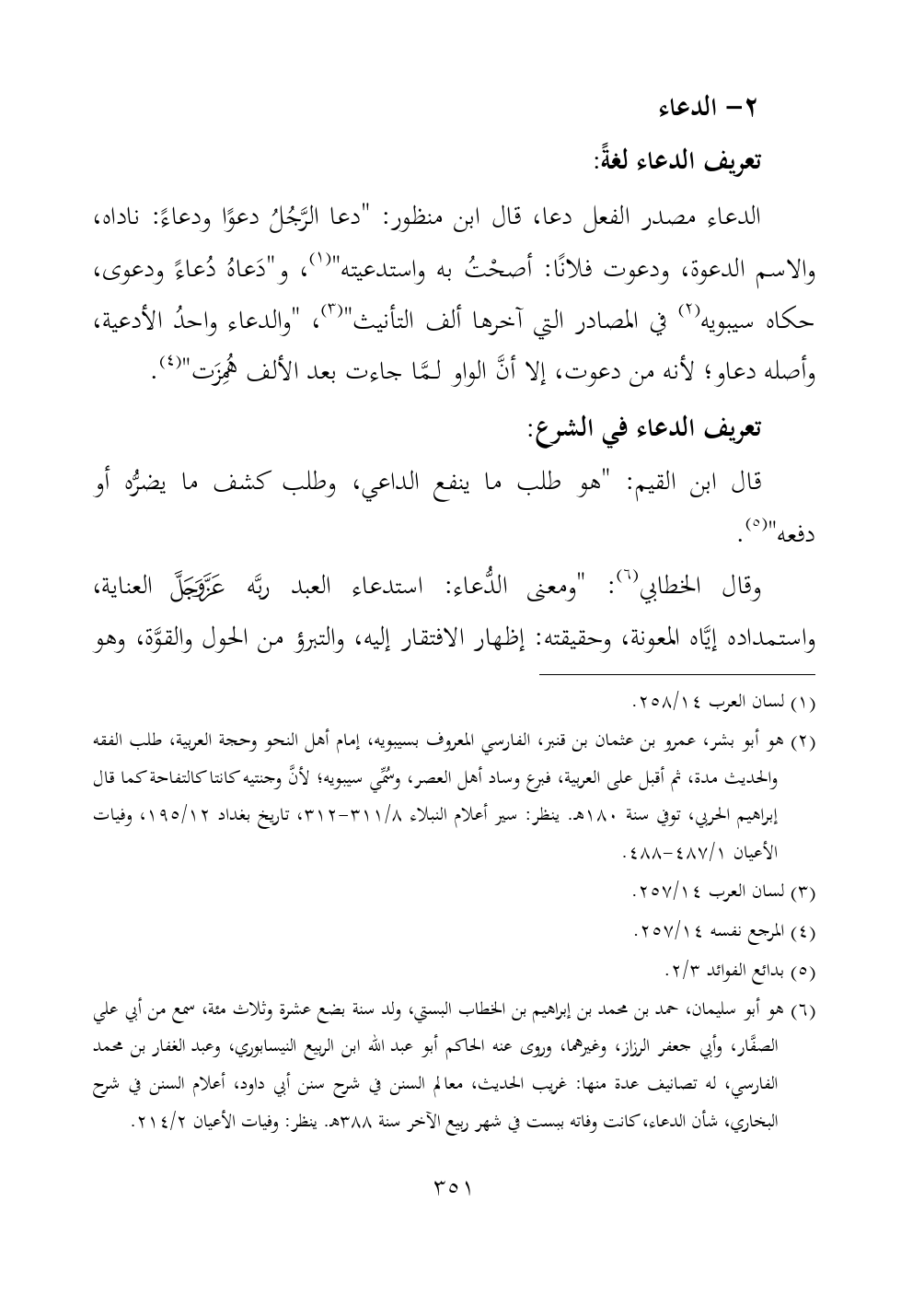 الدعاء مصدر الفعل دعا، قال ابن منظور: "دعا الرَّجُلُ دعوًا ودعاءً: ناداه، والاسم الدعوة، ودعوت فلانًا: أصحْتُ به واستدعيته" (¬١)، و"دَعاهُ دُعاءً ودعوى، حكاه سيبويه (¬٢) في المصادر التي آخرها ألف التأنيث" (¬٣)، "والدعاء واحدُ الأدعية، وأصله دعاو؛ لأنه من دعوت، إلا أنَّ الواو لمَّا جاءت بعد الألف هُمِزَت" (¬٤).